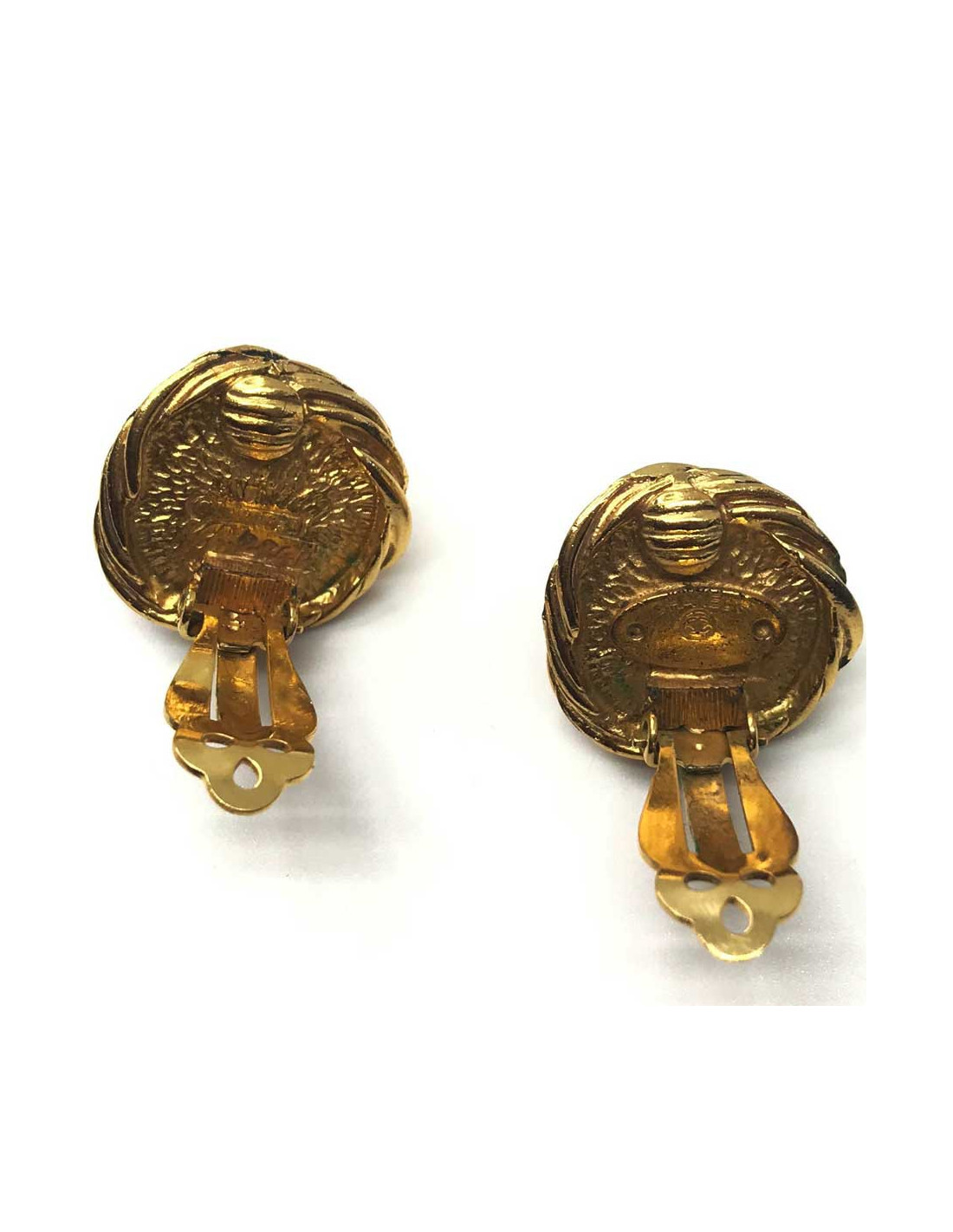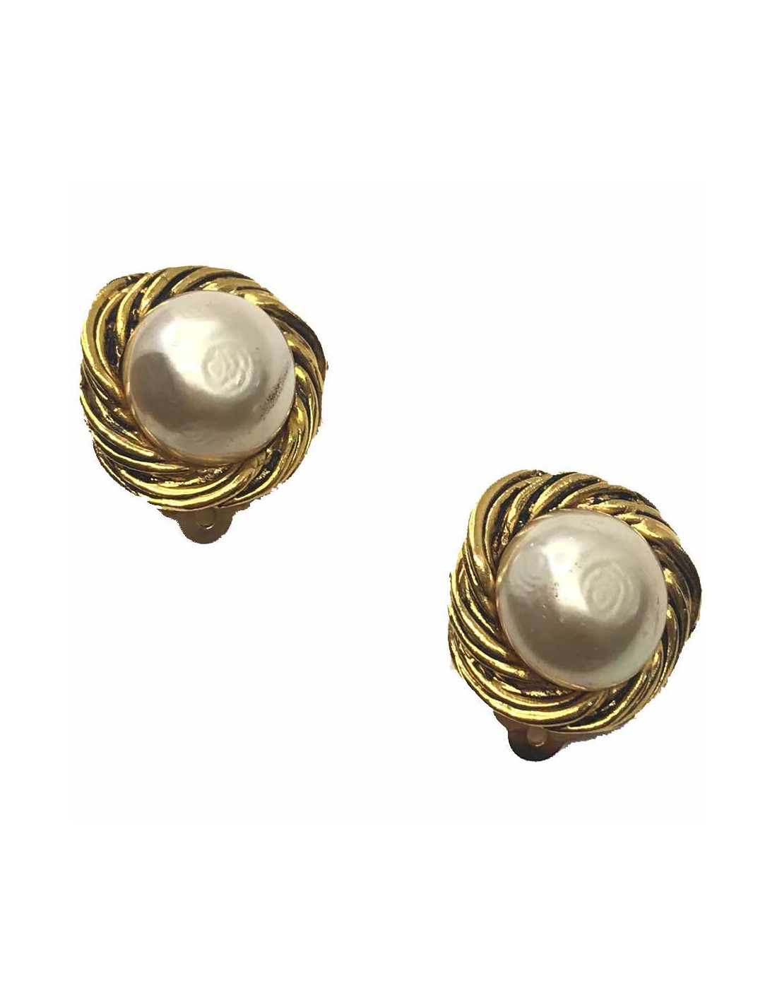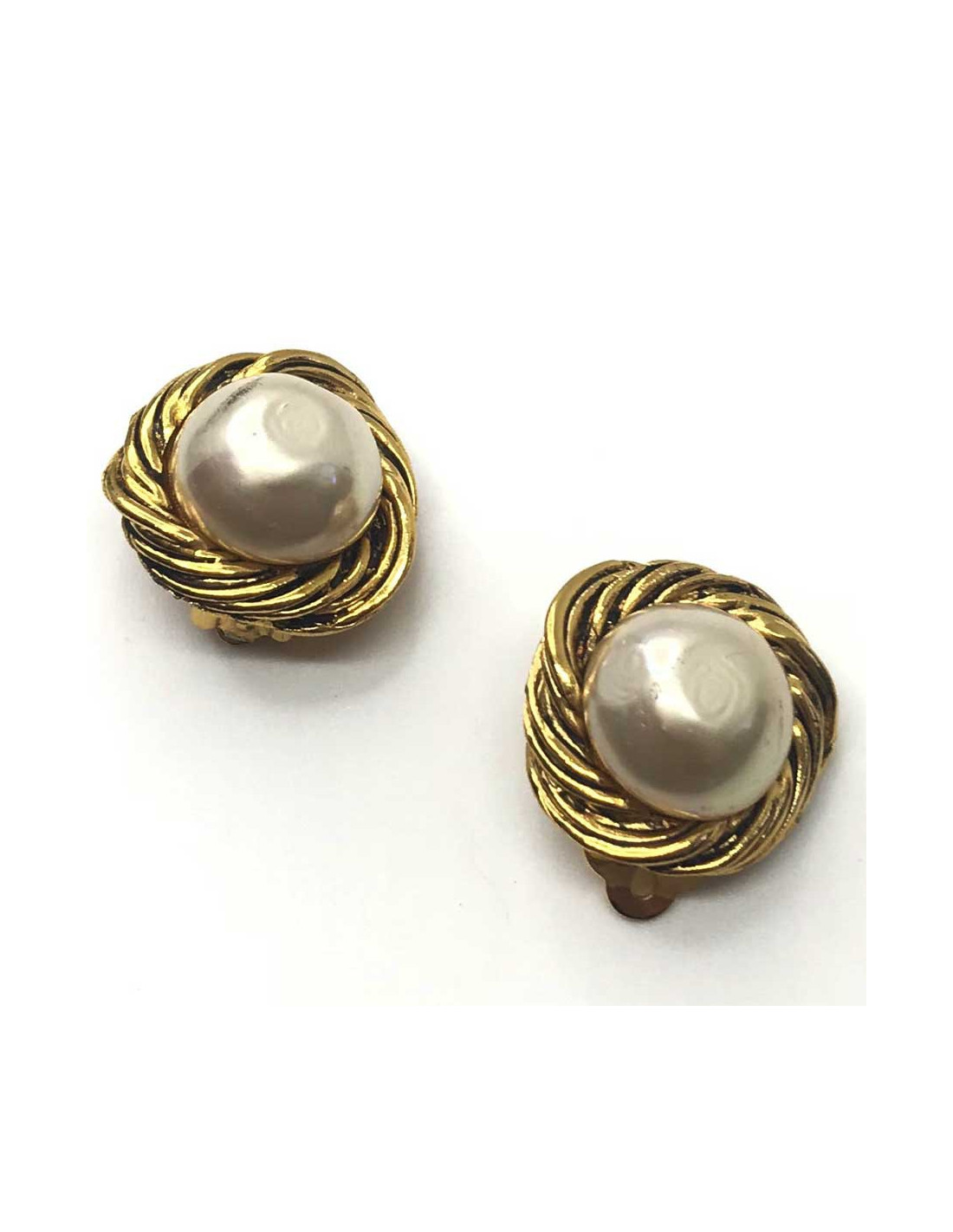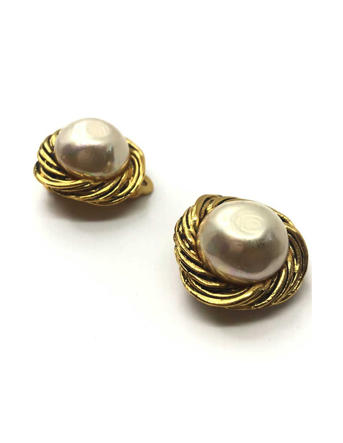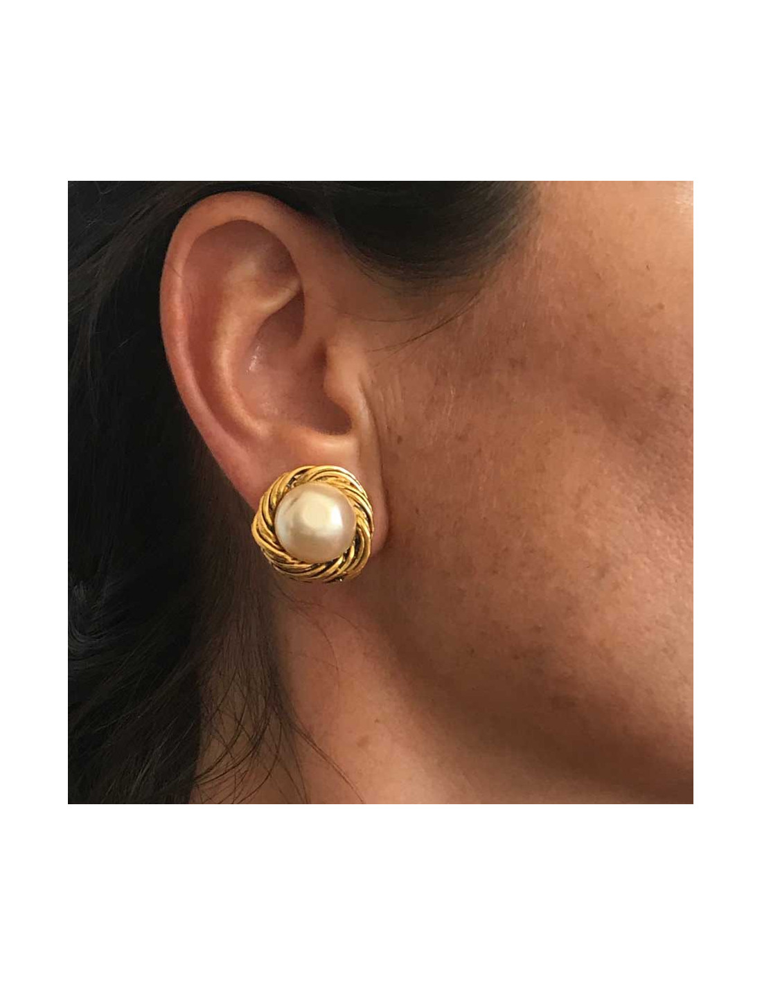 Les clips d’oreille sont vintage et issus de la Maison CHANEL. Ils représentent une forme ronde dont le contour est en métal doré torsadé, avec au centre une grosse perle nacrée.