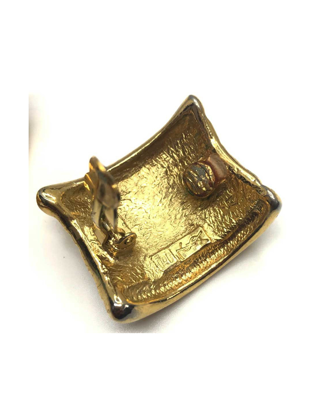 Les clips sont issus de la Maison Saint Laurent au temps de feu son créateur. De forme rectangulaire, ils sont en métal martelé, et doré à l'or fin.