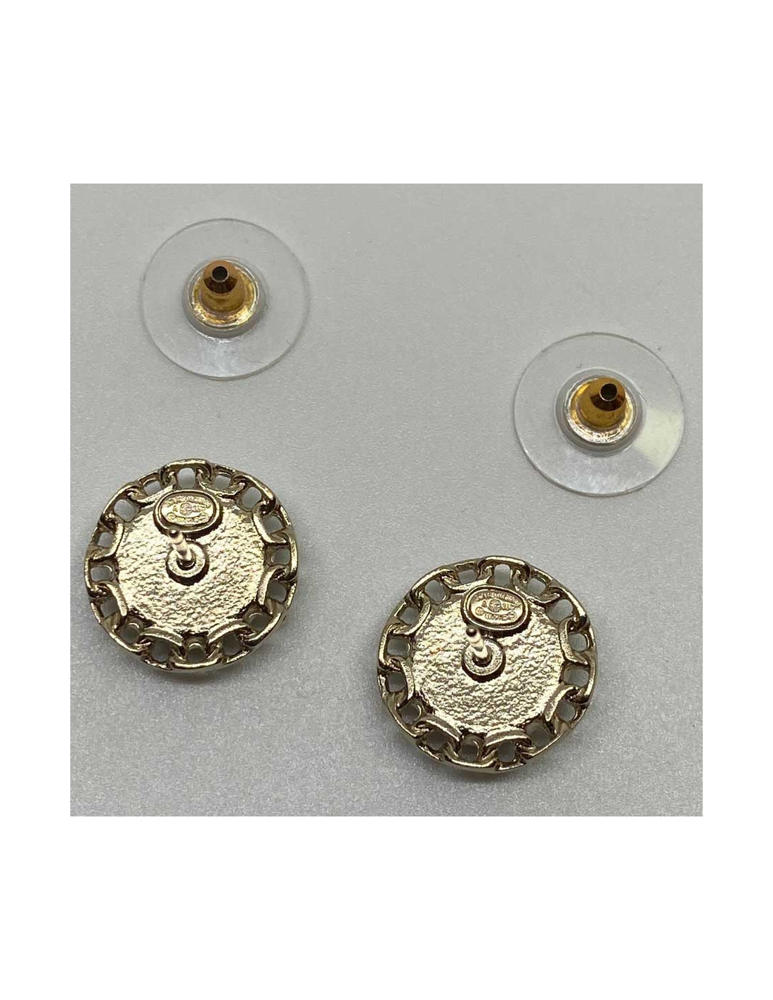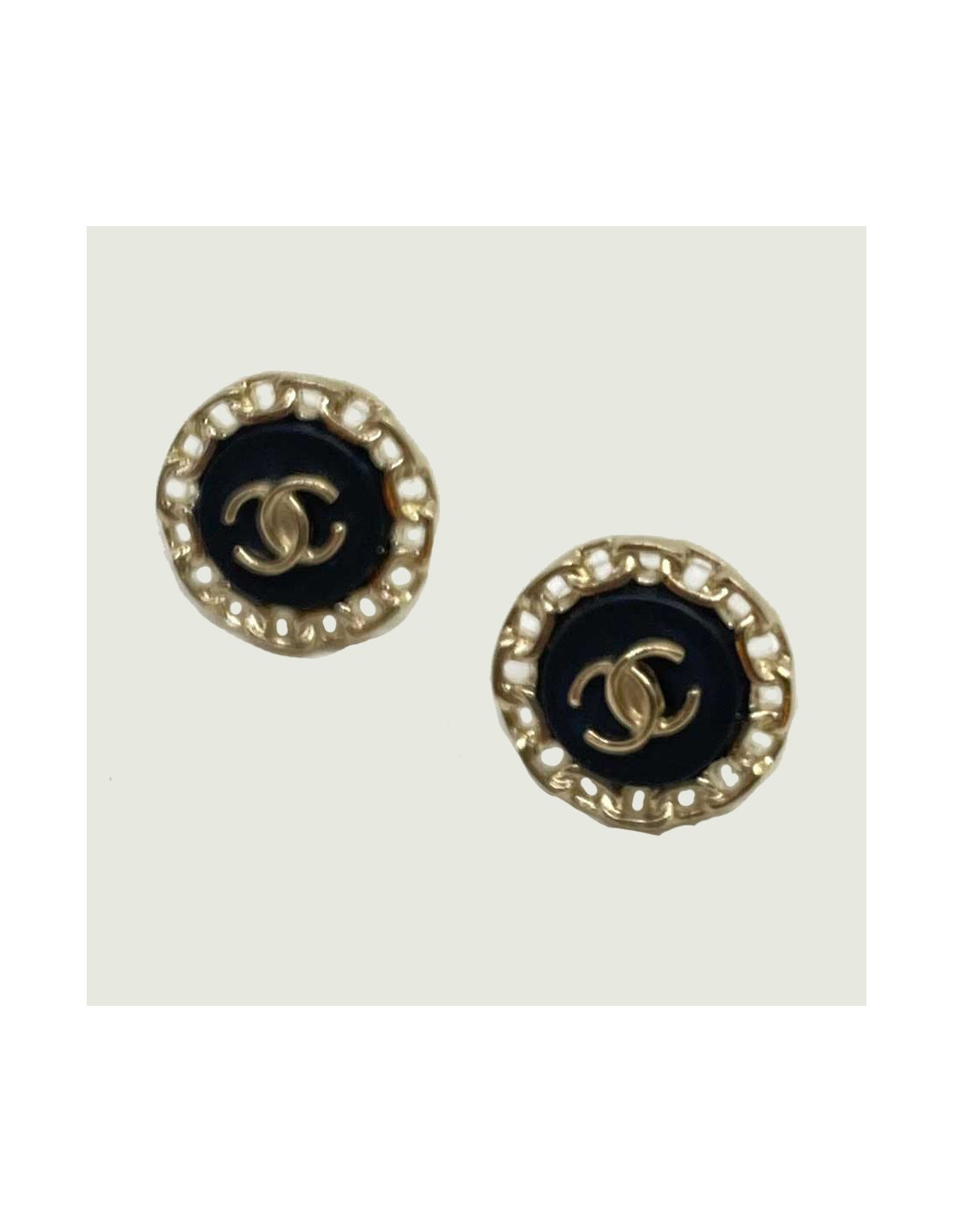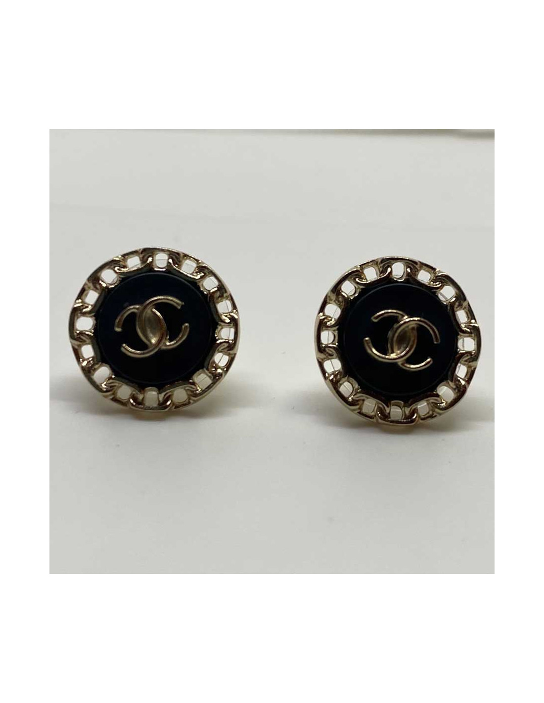 Les boucles d'oreille sont des clous de la Maison CHANEL. Elles sont rondes et représentent un CC sur fond noir encerclé par de la chaîne. De petite taille et légères à porter, elles sauront apporter une note d'esprit CHANEL à vos tenues.