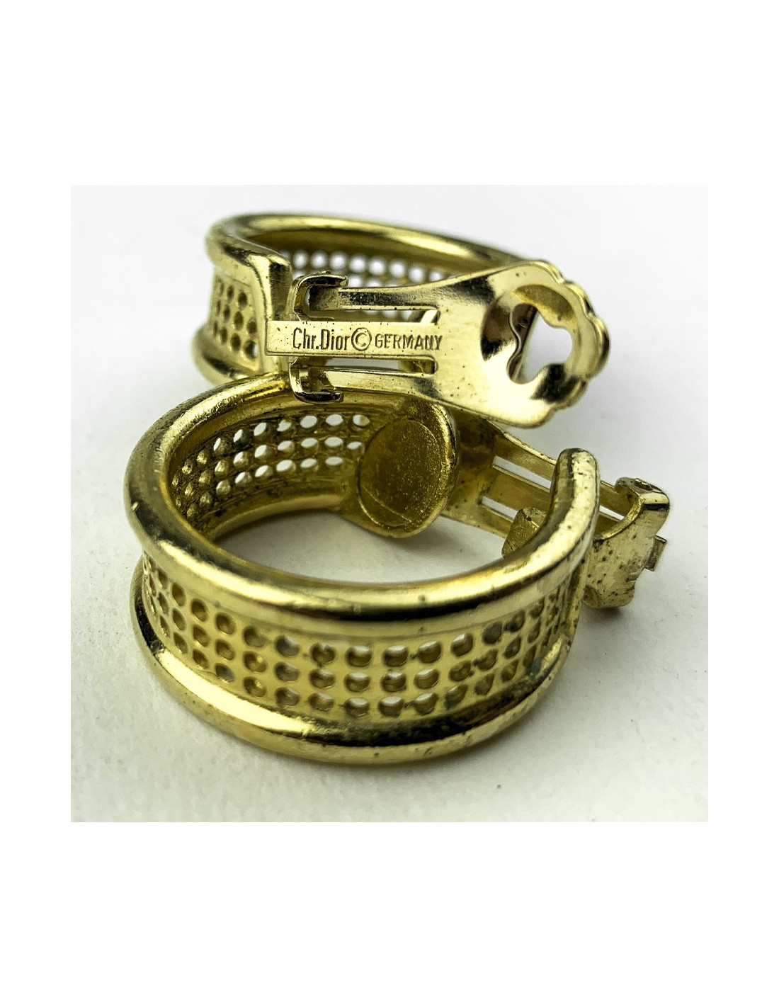 Les clips sont signés CHRISTIAN DIOR. Ils représentent deux créoles en métal doré à l'or fin et au motif grillagé.