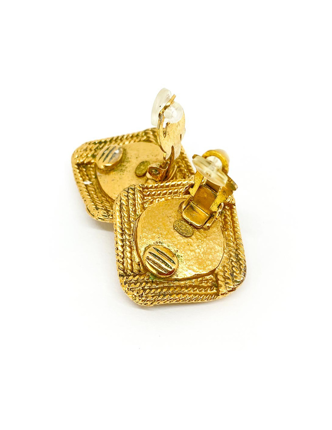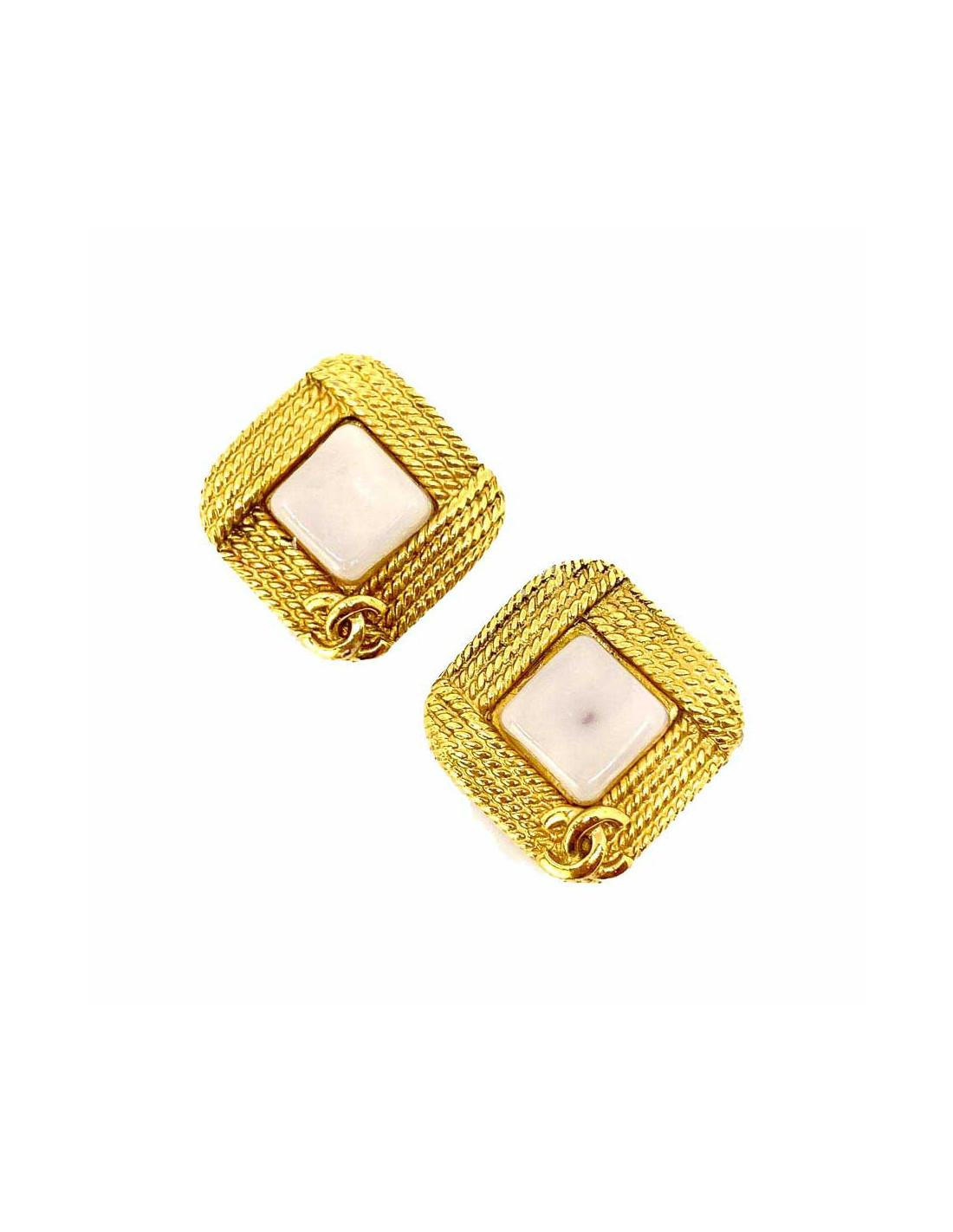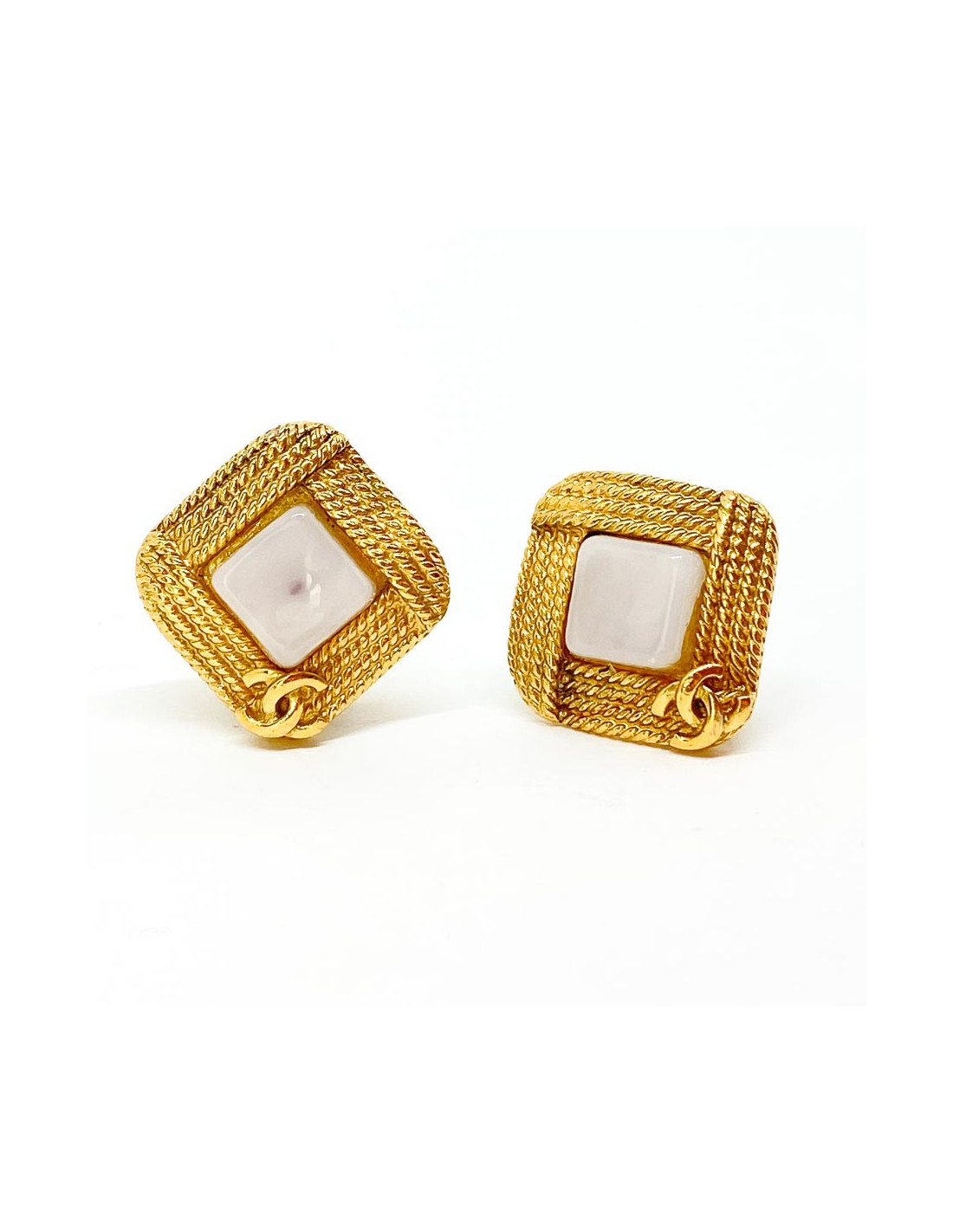 Les boucles d'oreille sont des clips signés de la Maison CHANEL. Ils sont de forme carrée en métal doré à l'or fin et comportent des cabochons de pâte de verre couleur blanche en leur centre. Ils sont parés par ailleurs des initiales CC de la marque. Mettez du chic vintage dans votre boîte à bijoux!