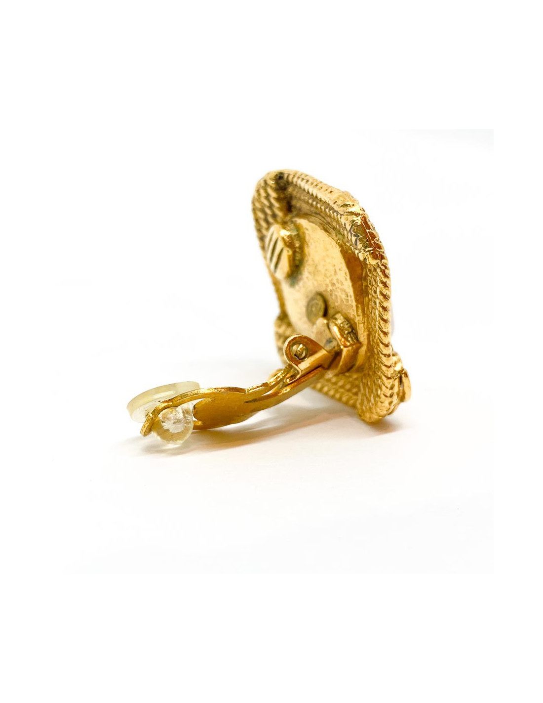 Les boucles d'oreille sont une pièce vintage en très bon état et les embouts en plastique de chacun des clips ont été changés par des neufs. Nous percevons un point noir dans la pâte de verre d'une des boucles, très certainement là depuis toujours. Chacun des clips mesure 2.5 x 2.5 centimètres. Présence de la pastille de la marque indiquant qu'ils sont issus de la Collection Automne-Hiver 1986 et qu'ils sont Made In France.