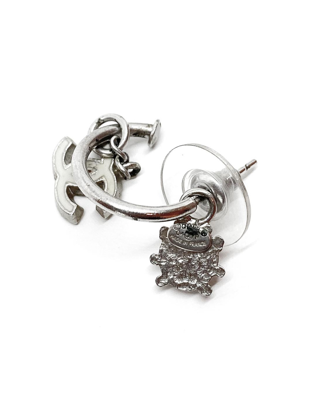 Les boucles d'oreille sont en très bon état. Elles ont une longueur une fois portées de 3 centimètres. Présence de la pastille de la marque sur laquelle figure l'année de Collection: Printemps/Été 2004 ainsi que la mention Made In France.