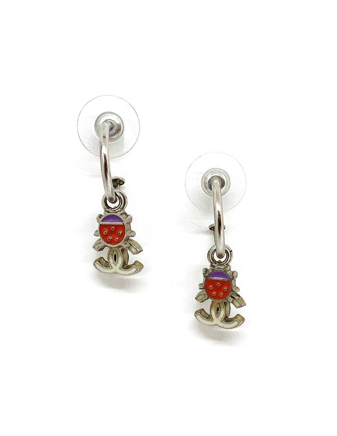 Les boucles d'oreille sont des clous de la Maison CHANEL. Une petite coccinelle rose et violette pend sur un anneau en métal argenté, au côté d'un petit CC blanc.