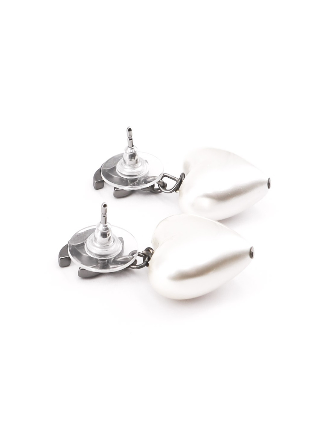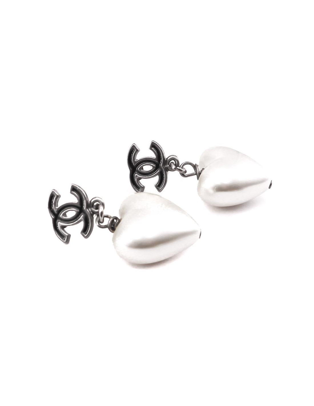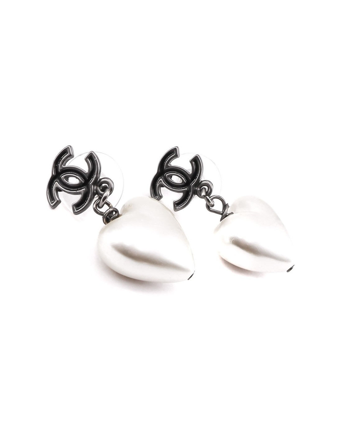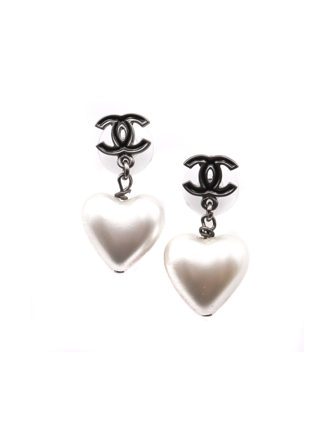 Les boucles d'oreille sont des clous créés par la Maison CHANEL. Ils ont un CC en émail noir et métal au niveau du clou sur lequel se balance un coeur nacré. Habillez-vous avec amour!