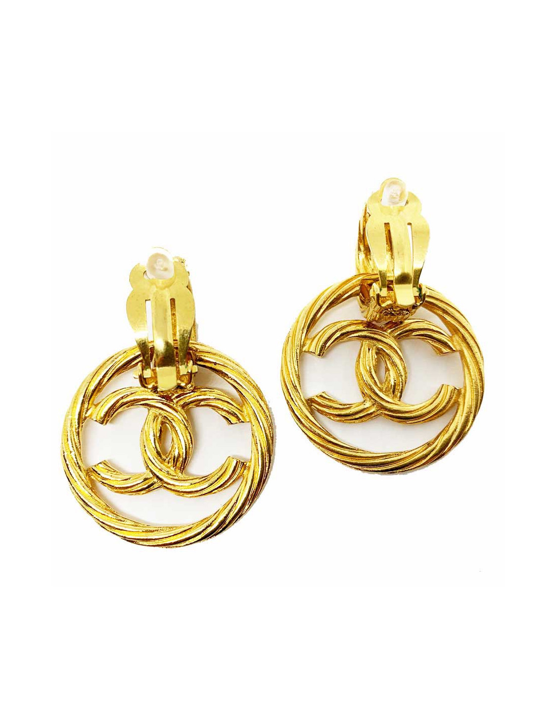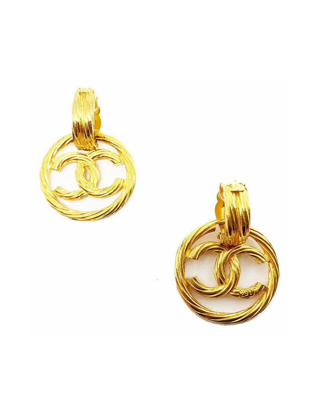 Les boucles d'oreille sont signées CHANEL. Chacune se compose de deux anneaux qui s'emboîtent, et qui peuvent donc aussi se porter séparément. Un grand anneau encercle le CC CHANEL, lequel est tenu par un autre plus petit au niveau du fermoir. Les boucles d'oreille sont en métal torsadé et doré à l'or fin.