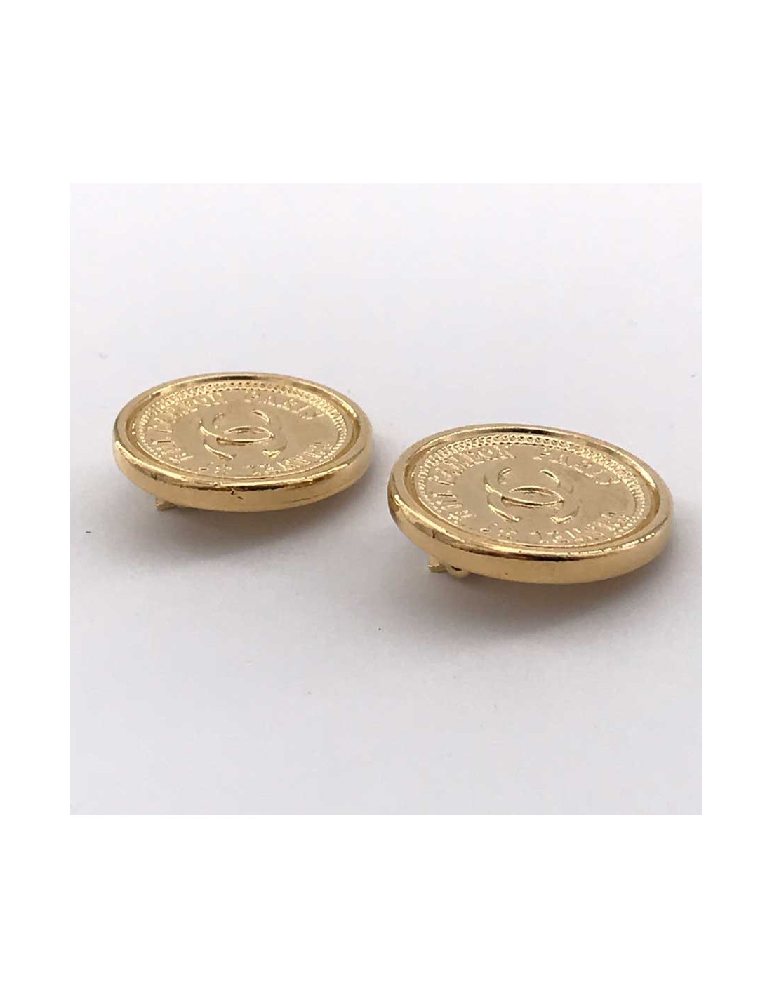 Les boucles d'oreille sont des clips de la Maison CHANEL. Ils ont une forme ronde, semblables à des pièces de monnaie en métal doré à l'or fin, avec pour inscription centrale l'emblème de la marque CC, entouré par l'adresse incontournable CHANEL, 31 Rue Cambon Paris.