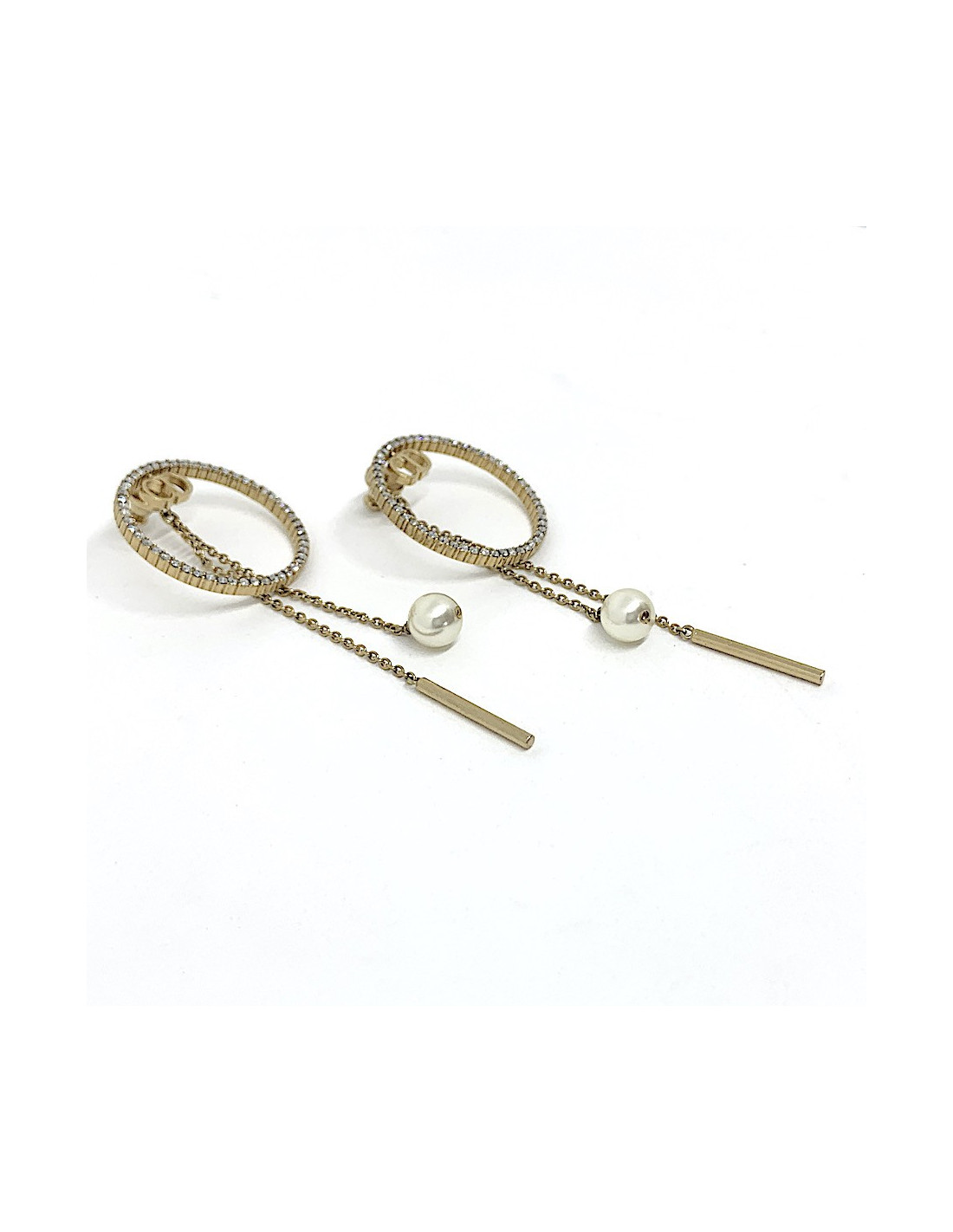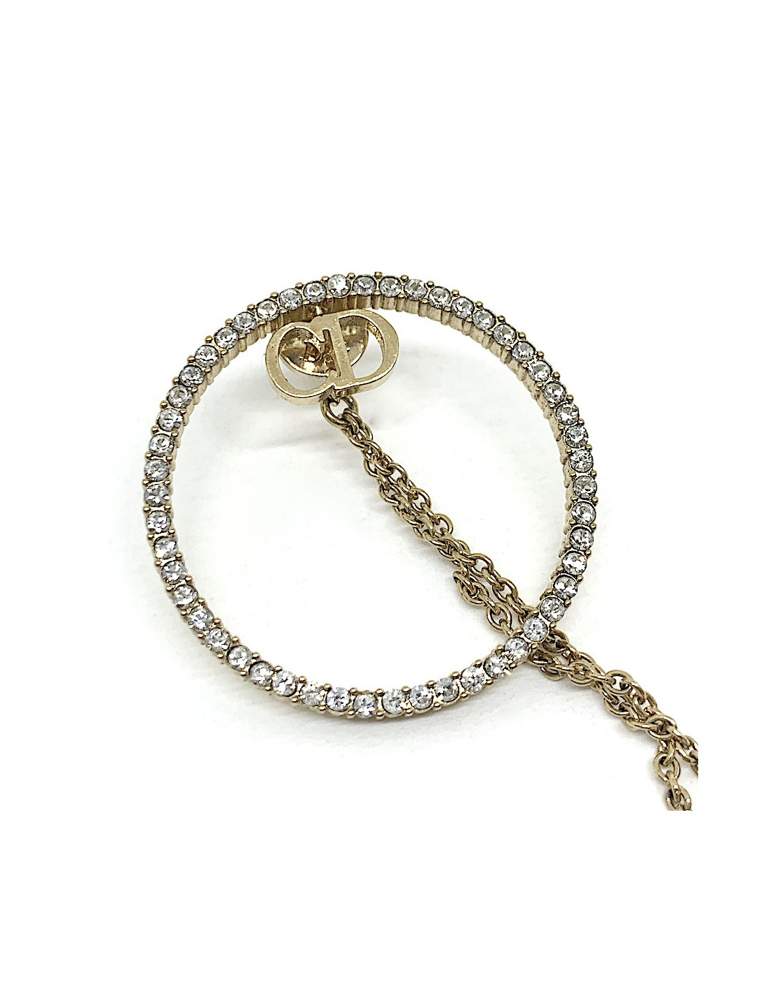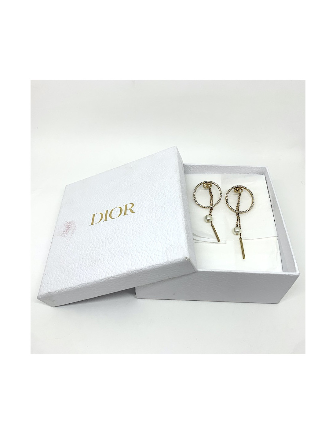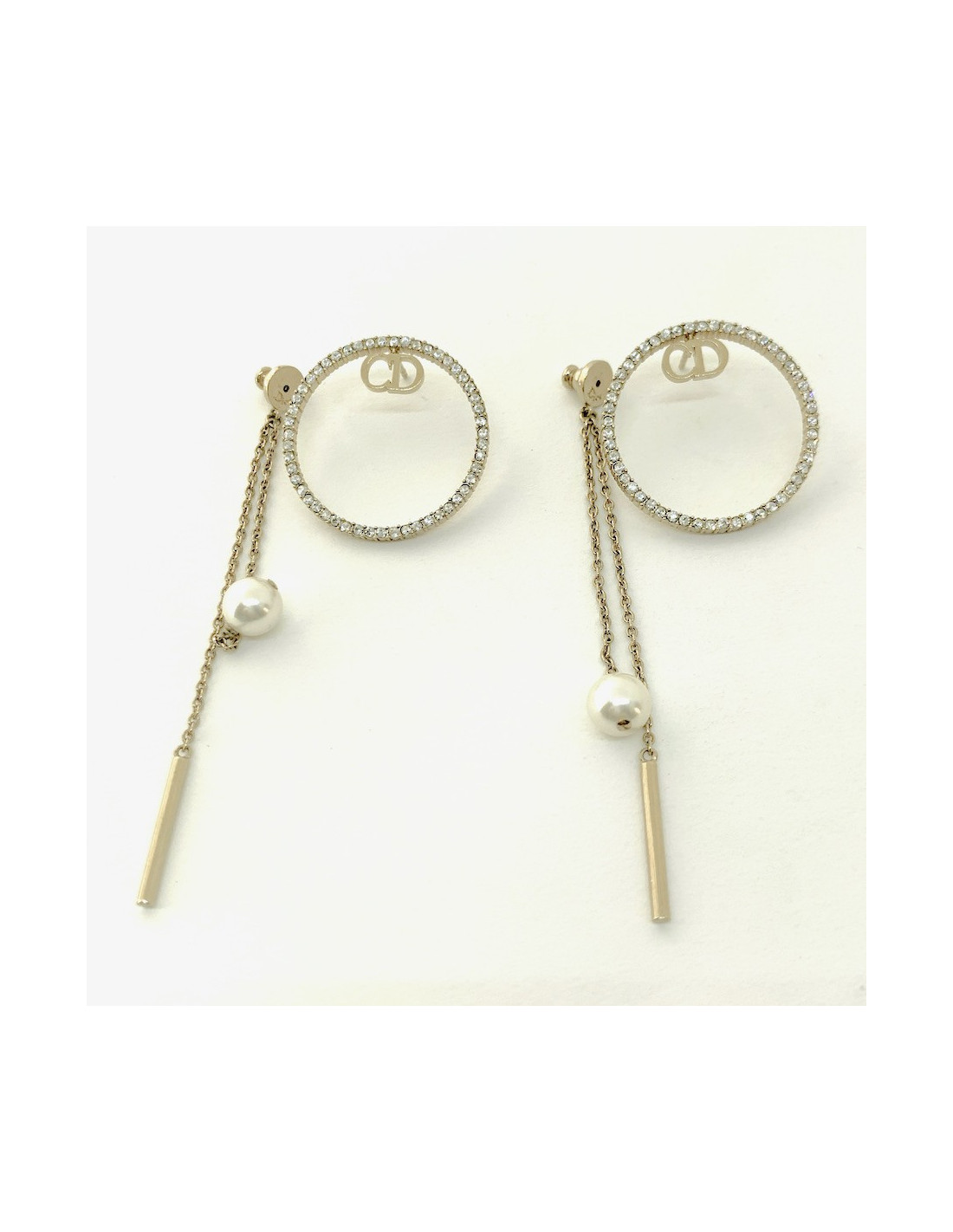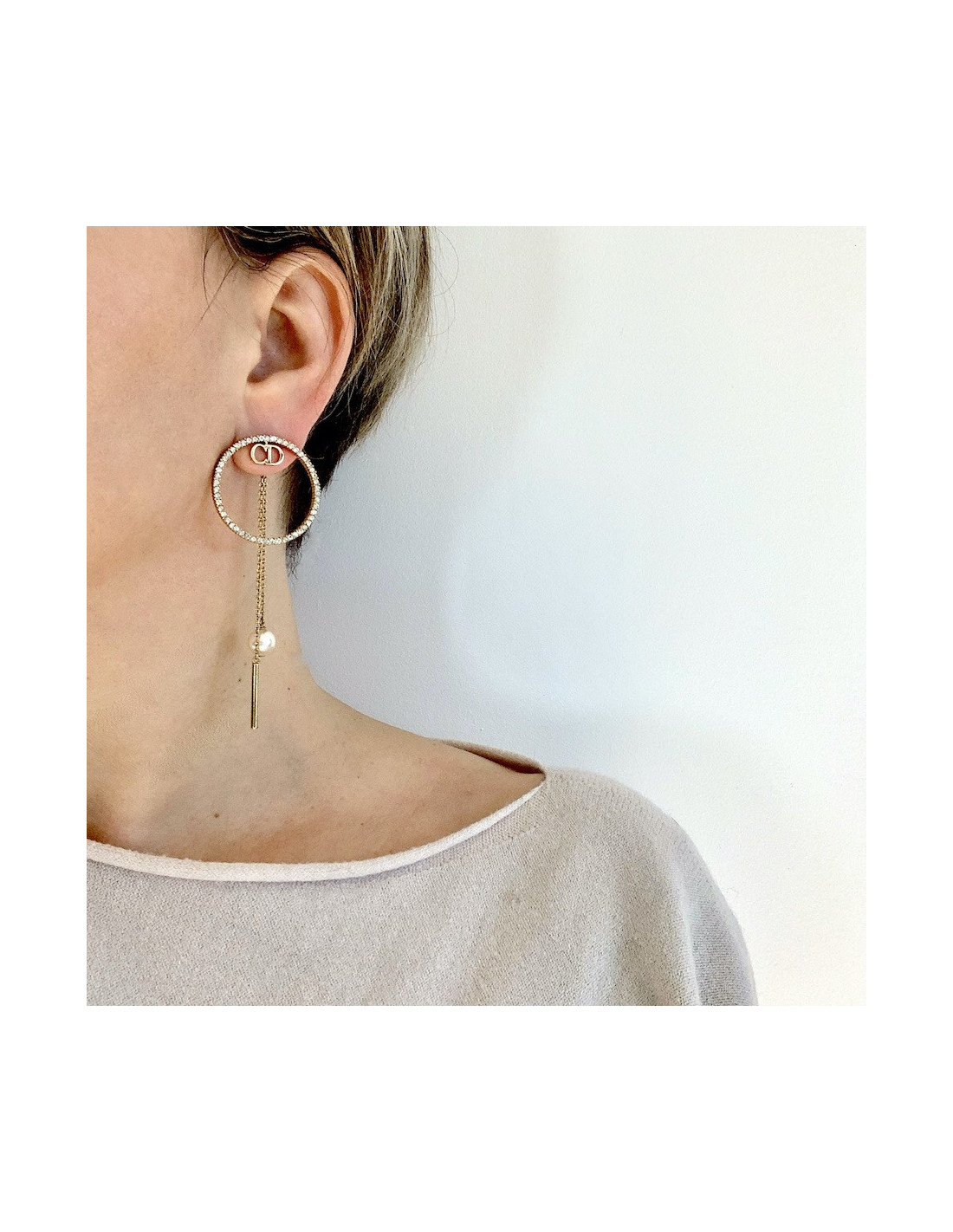 Boucles d'oreille DIOR anneau entièrement serti de strass. Le fermoir pressoir est agrémenté de 2 pendants se terminant par une perle et une tige en métal doré. Le logo CD se situe en haut de chaque anneau.