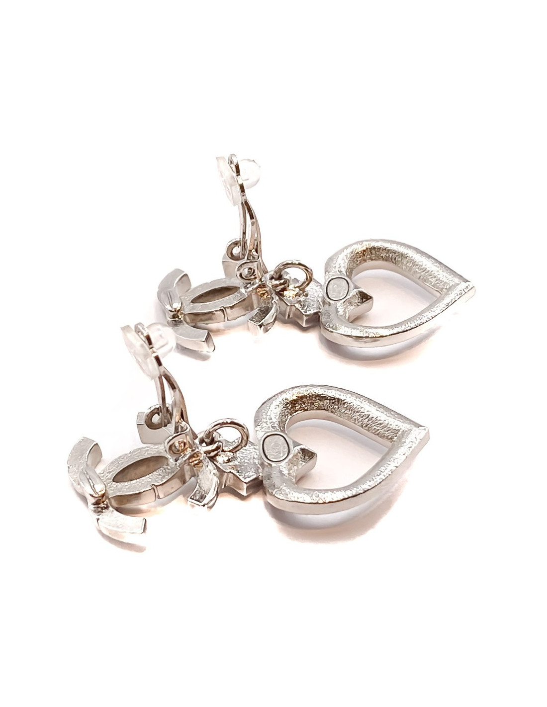 Les boucles d'oreille sont de le Maison CHANEL. Elles sont pendantes, un CC en strass blancs au niveau du fermoir sur lequel est suspendu un coeur en strass rouges.