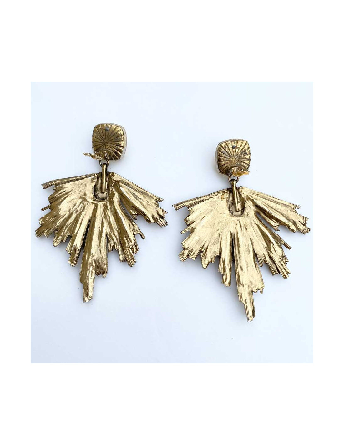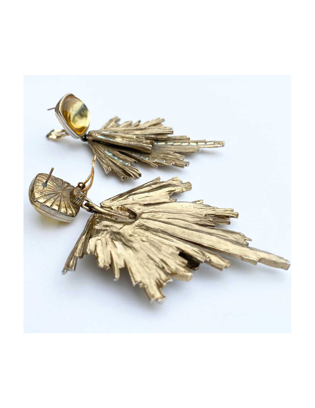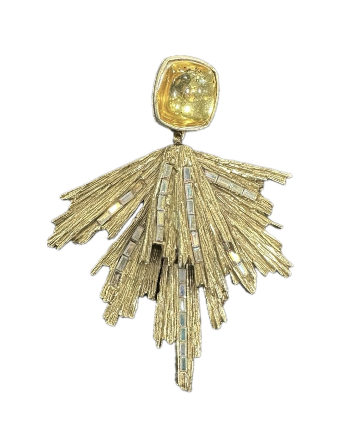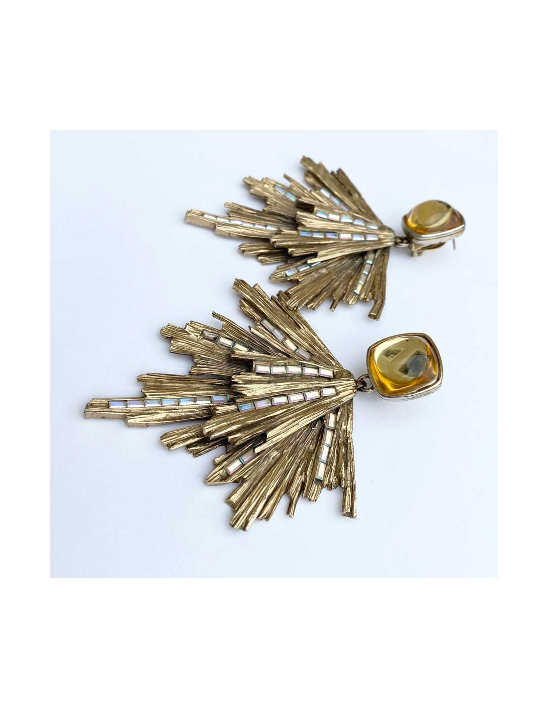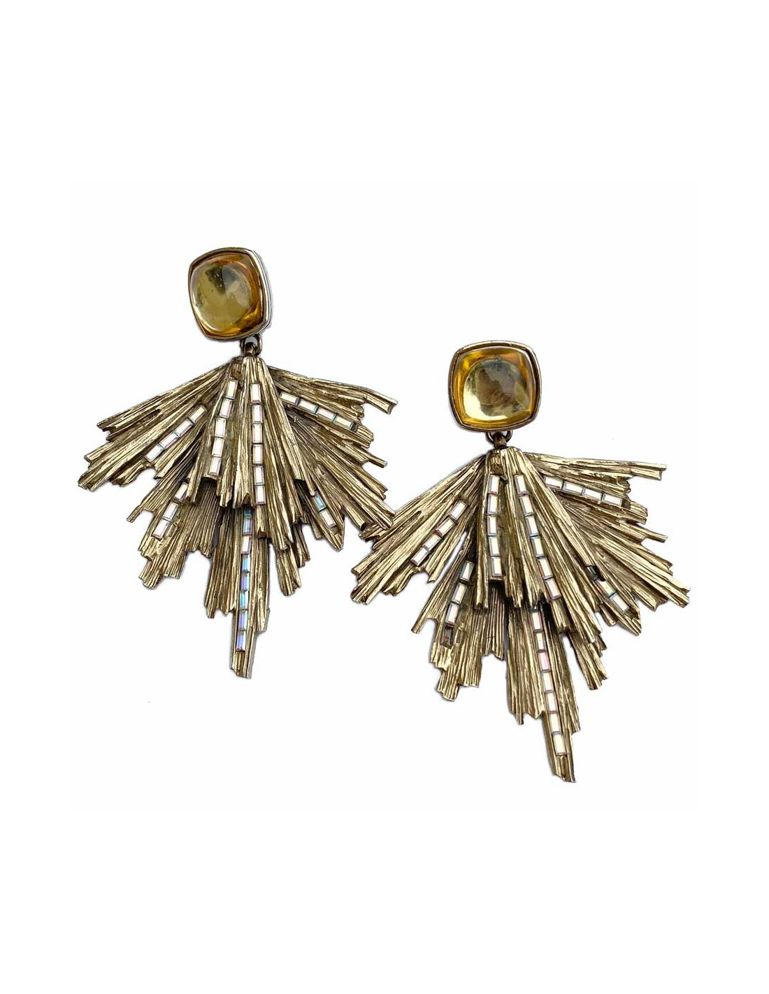 Ces clous d’oreilles Yves Saint Laurent en métal doré vieilli pavé par endroit de strass rectangulaires sont sublimes. Au niveau de l’attache, un dôme arrondi en résine jaune clair est le départ de ces tiges de métal doré striées. On les adore, ce sont des pièces collector