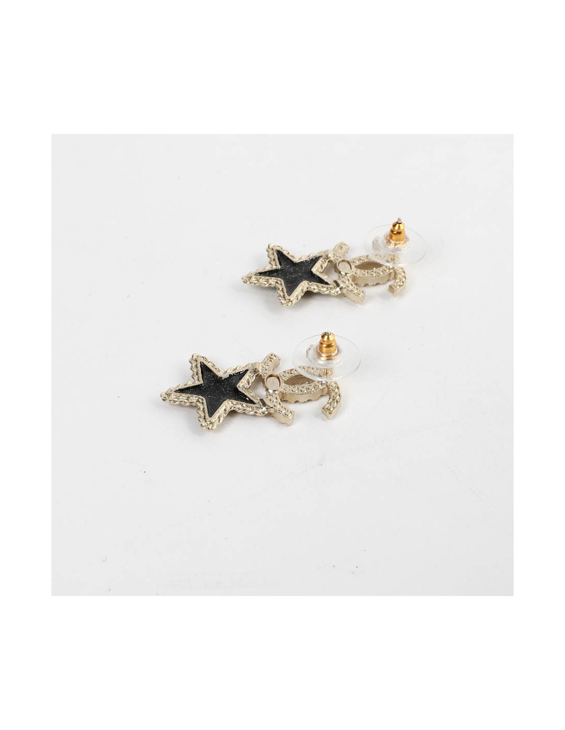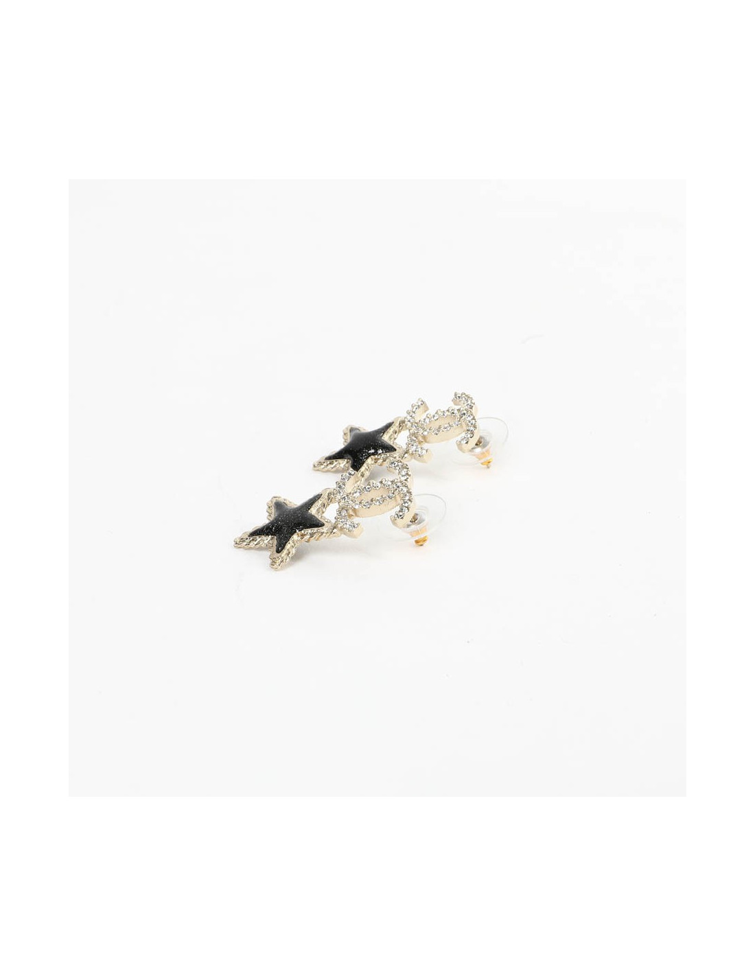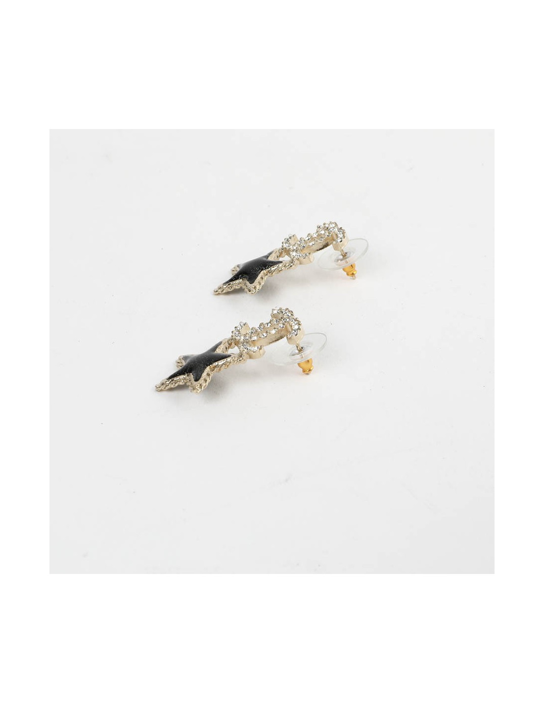 Boucles d'oreille clous Chanel CC sertis de strass et étoile en résine noir pailleté et métal dorées or pâle.
