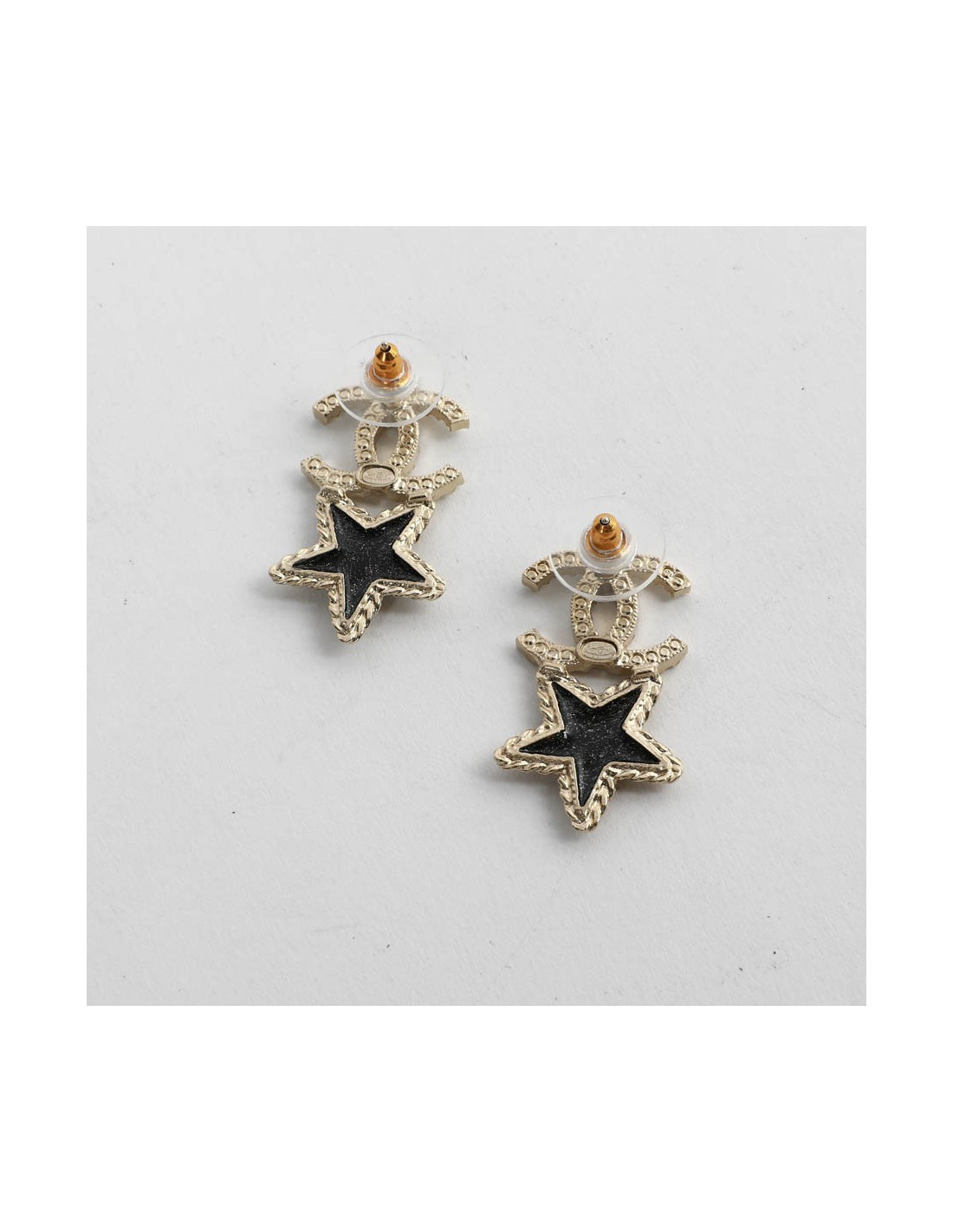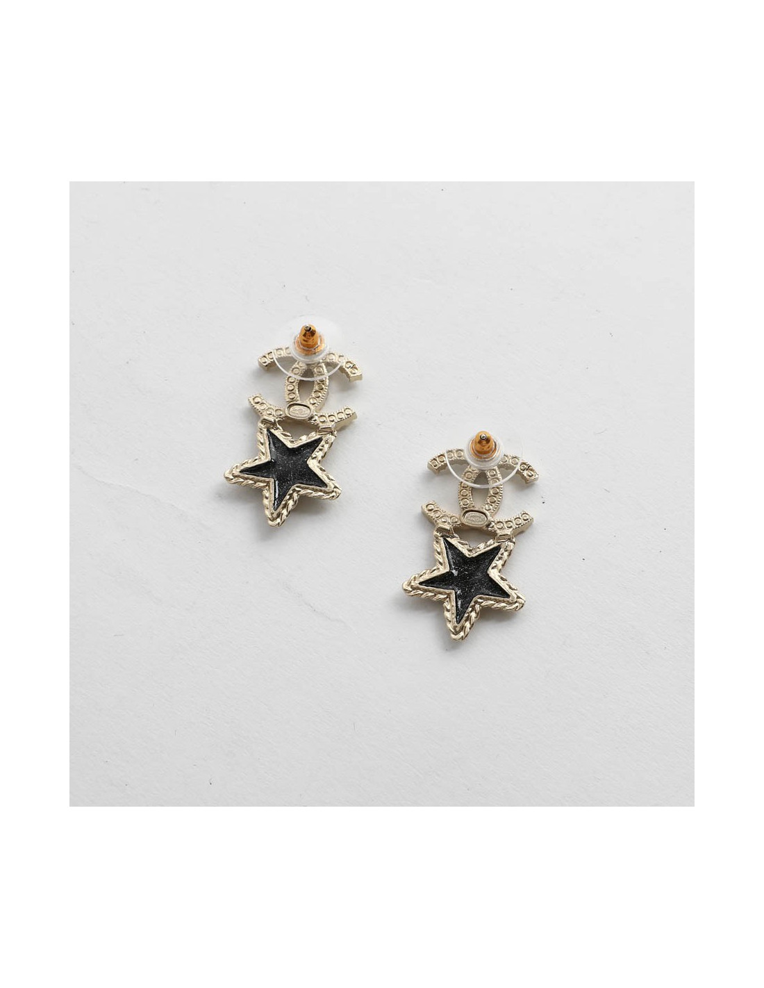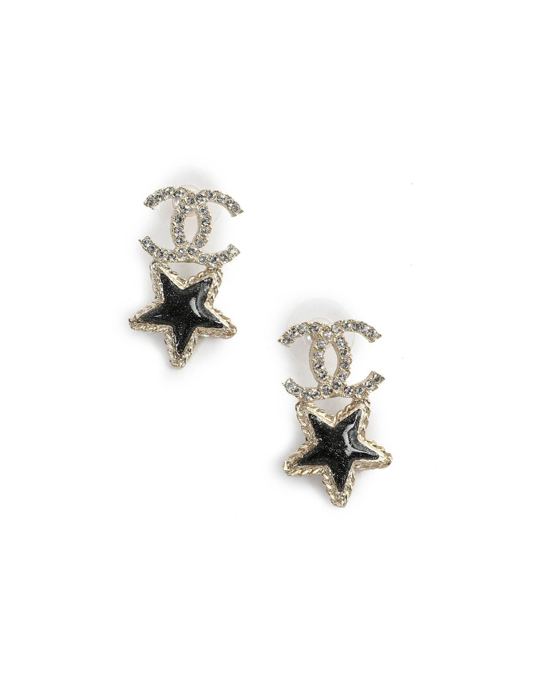 Boucles d'oreille clous Chanel CC sertis de strass et étoile en résine noir pailleté et métal dorées or pâle.