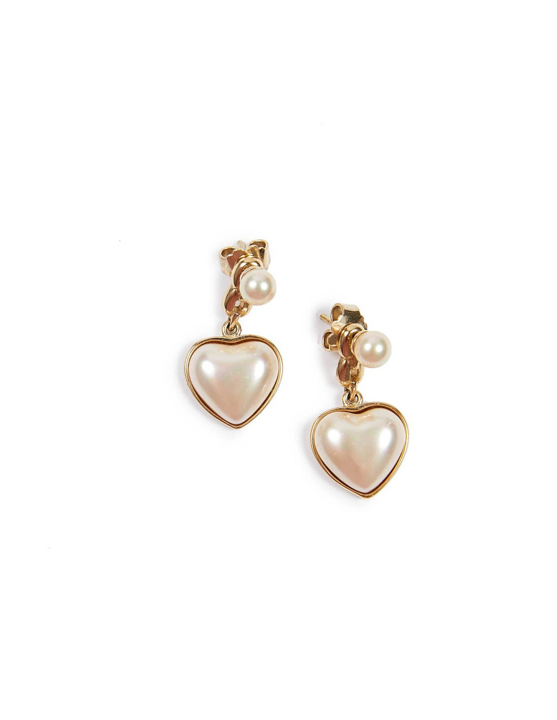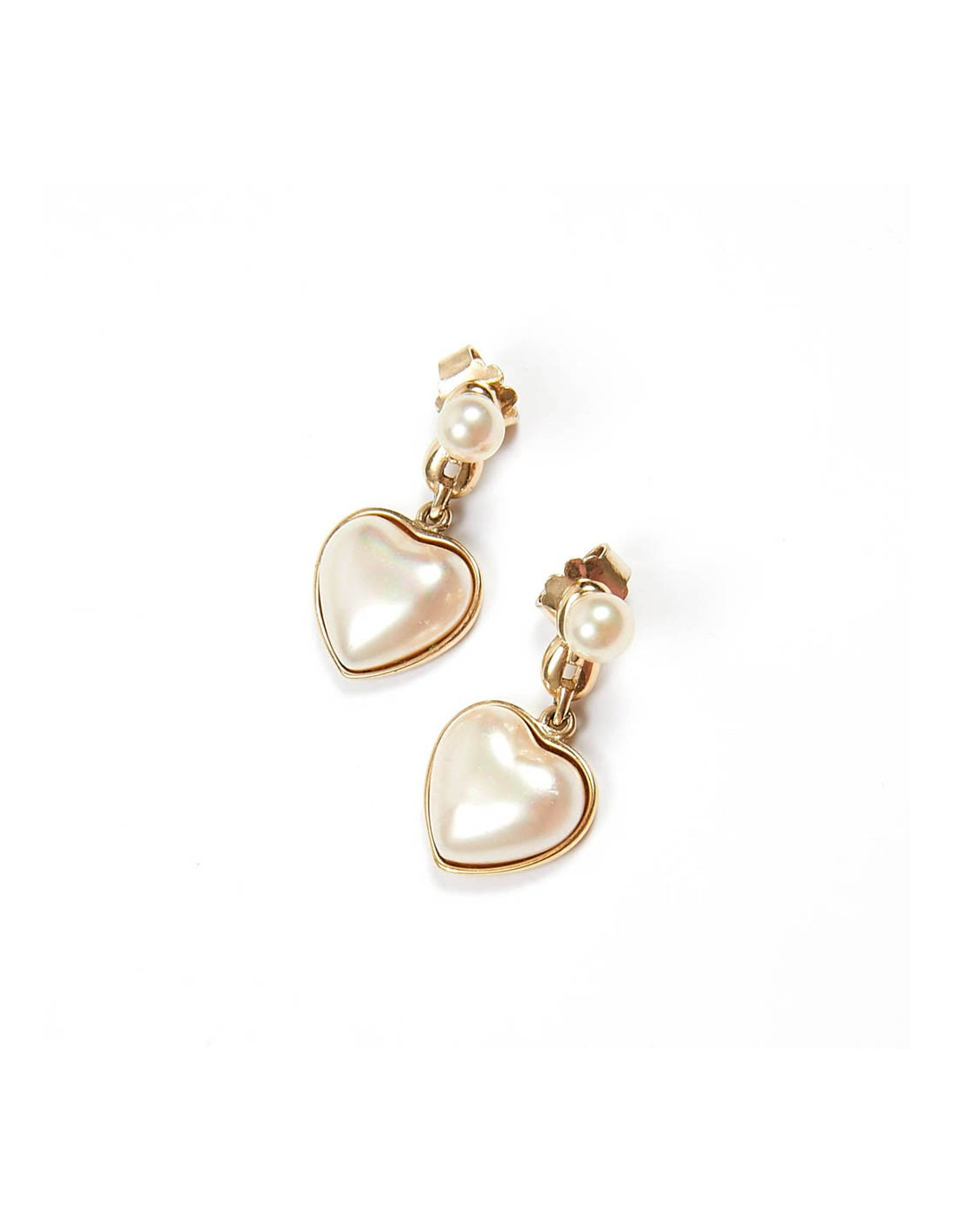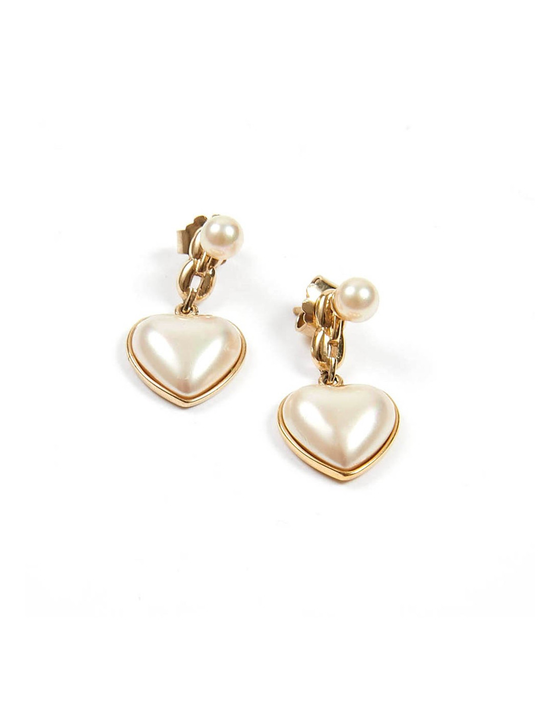 A porter de jour comme de nuit, ces délicates boucles d'oreille sont en or 925/°°° 18 carats. Elles sont agrémentées d'un coeur recouvert de nacre. Ces clous se portent de 2 manières. L'un avec le coeur pendant, ou l'autre seulement avec la perle.