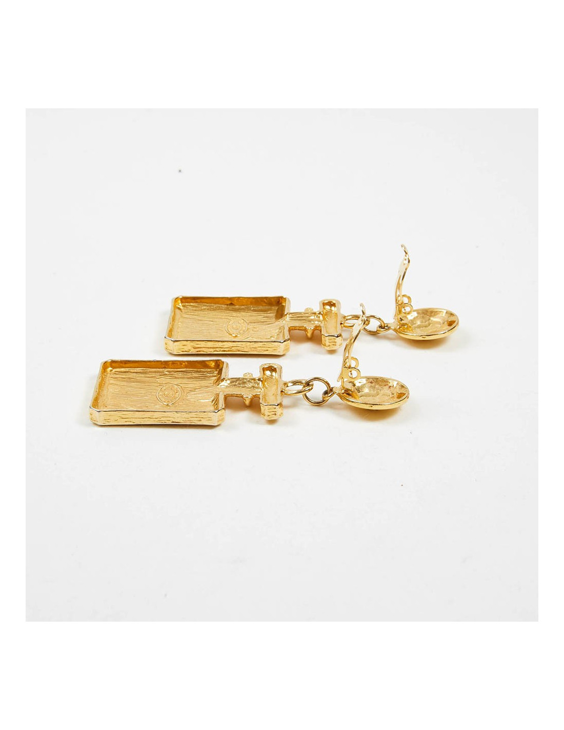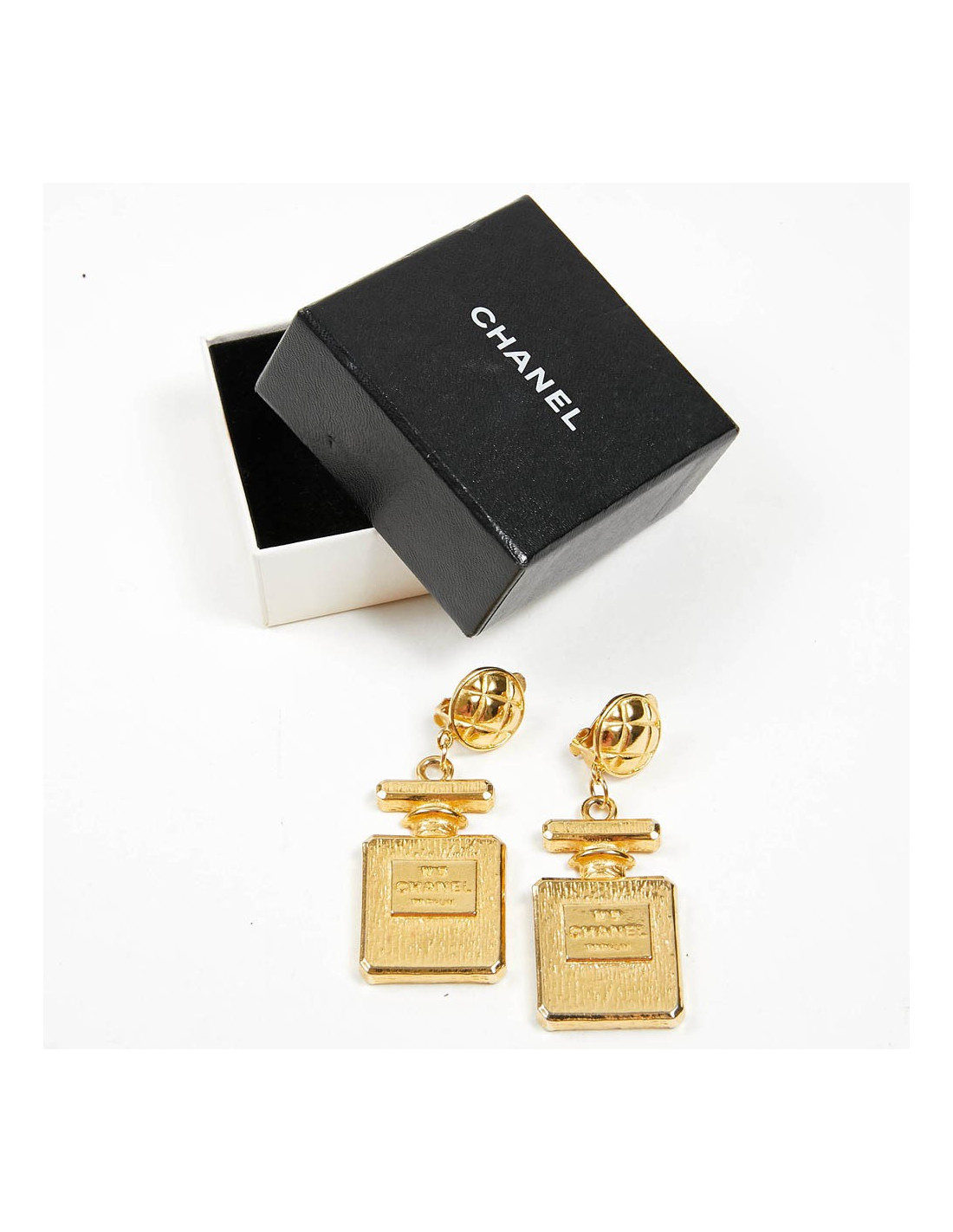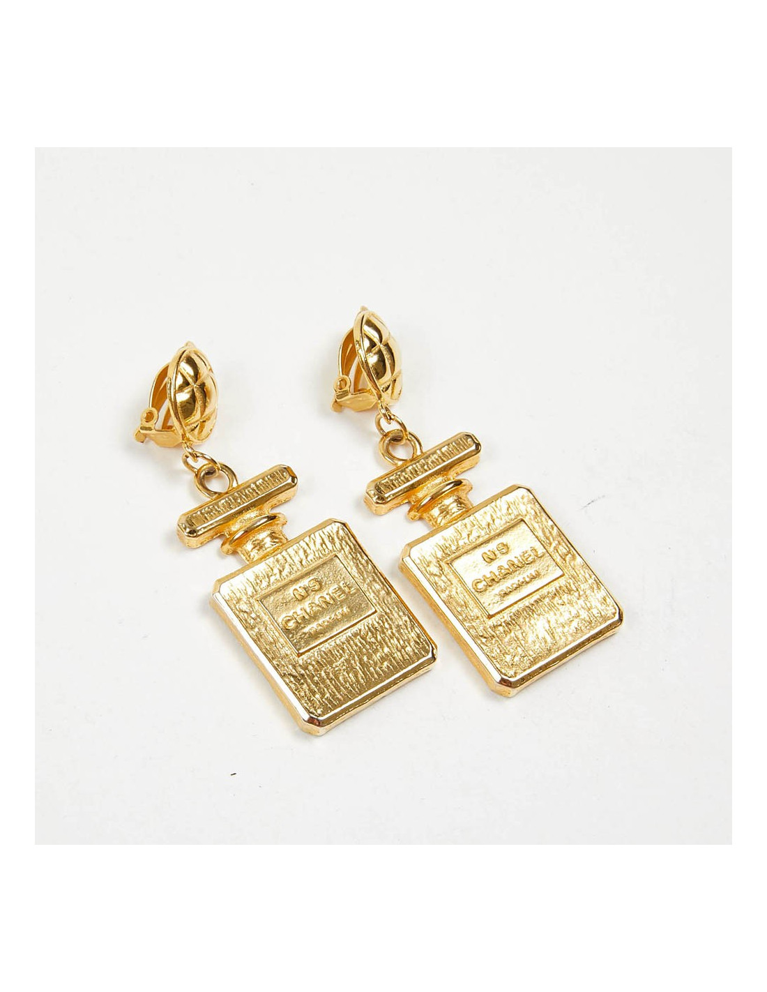 Clips d'oreille Chanel, représentant l'incontournable bouteille de parfum N 5. Ils sont en métal dorés vintage. A l'arrière le stamp Chanel.