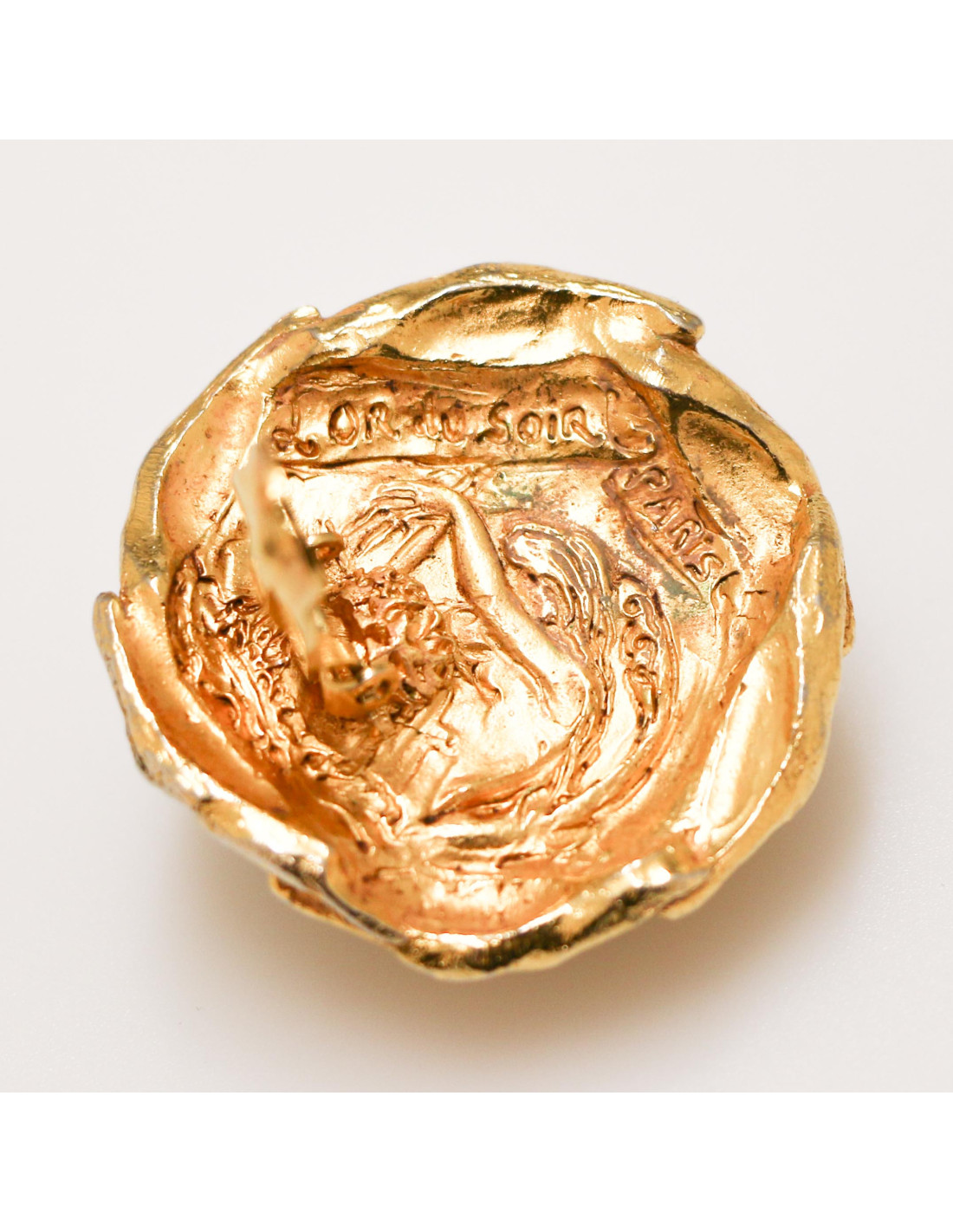 Détails : inscription "or du soir" au dos de la boucle, pâte de verre sculptée en forme de fleur, reflets vert et orange