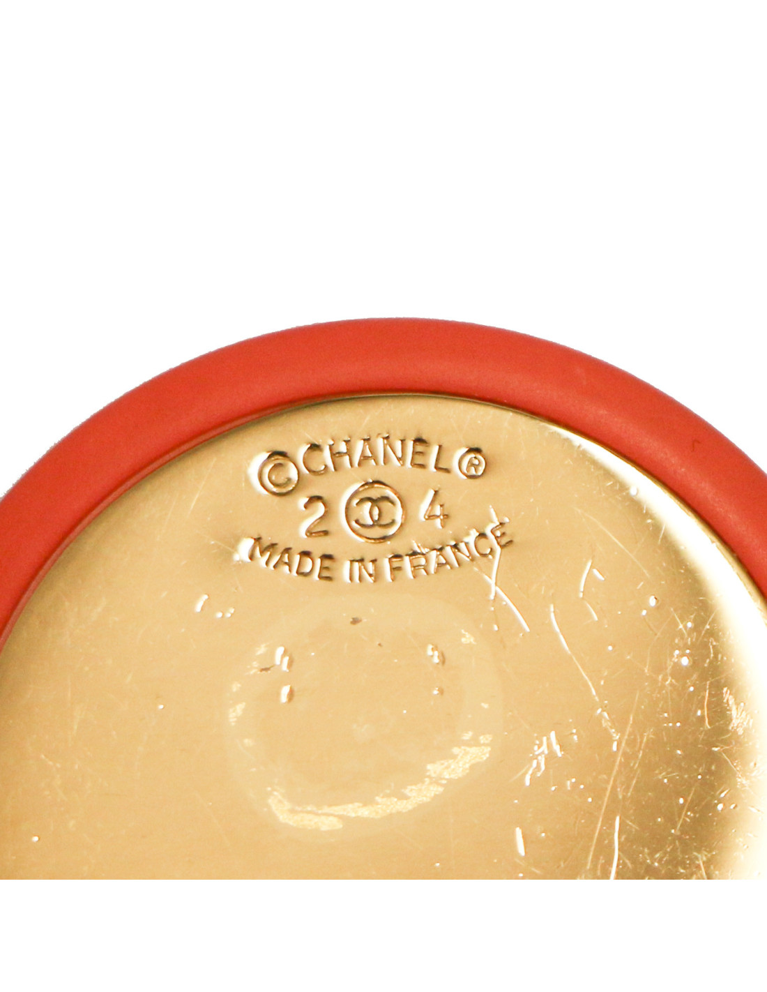 Détails : gros rond en résine rose avec pendentif CC doré