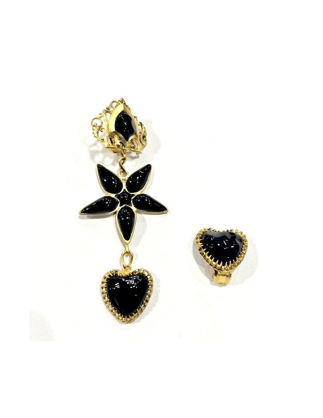 Détails : Boucles d'oreilles Marguerite de Valois en pâte de verre. La première boucle est longue avec un motif étoile suivi d'un coeur. La boucle pendante se ferme par un clou alors que la deuxième boucle se ferme par un clip en forme de coeur.