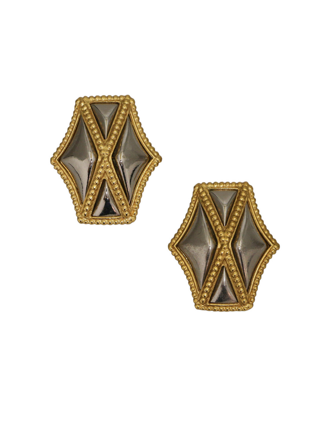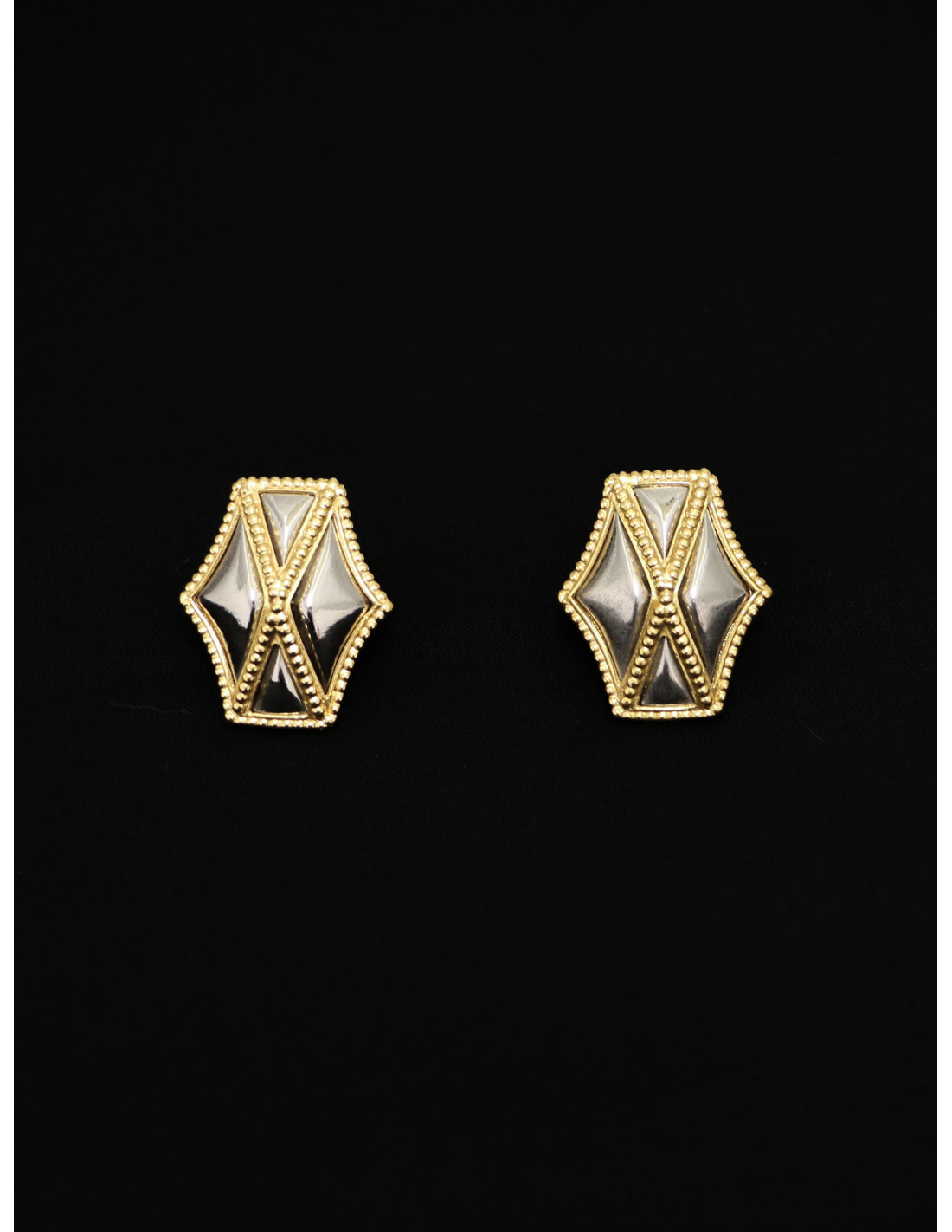 Détails : design géométrique en forme d'écusson stylisé. Inserts en émail canon de fusil sertis en triangles, contrastant avec la monture dorée perlée.
