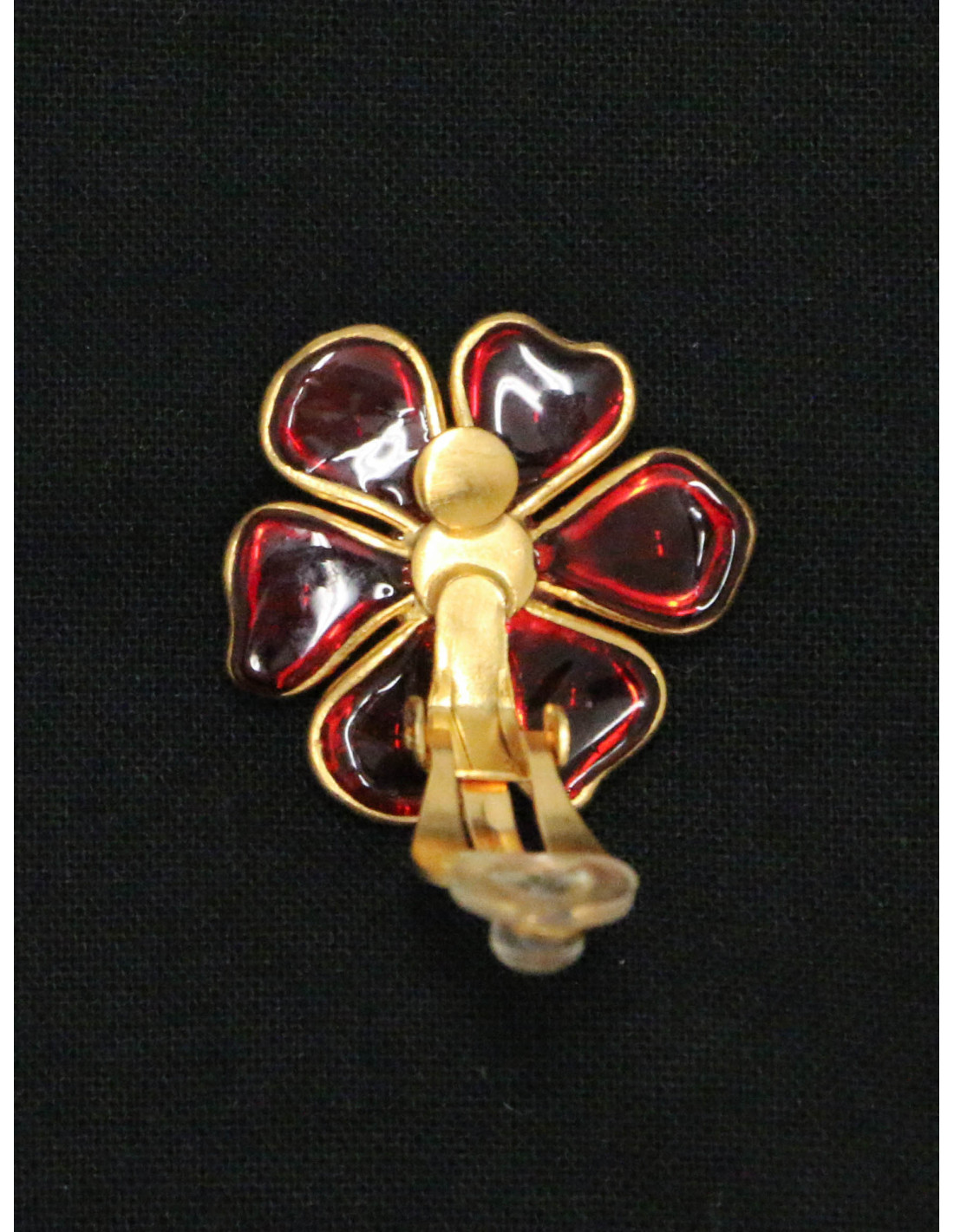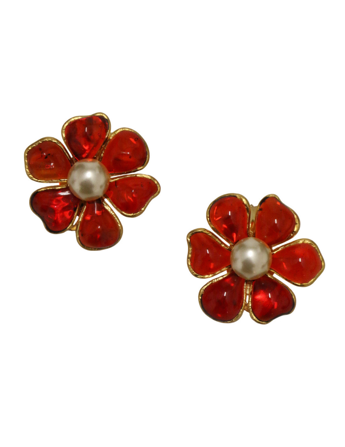 Détails : petits clips formant une marguerite en pâte de verre dont le centre est orné d'une perle nacrée. Ces clips d'oreille sont signés de la Maison Marguerite de Valois qui fabrique ses bijoux dans ses ateliers parisiens. Elle utilise une technique ancestrale pour la création de ses pièces, le travail de la pâte de verre, classé dans la catégorie des métiers d’art. La production est donc entièrement fait main, Marguerite de Valois tenant à conserver un savoir-faire artisanal.