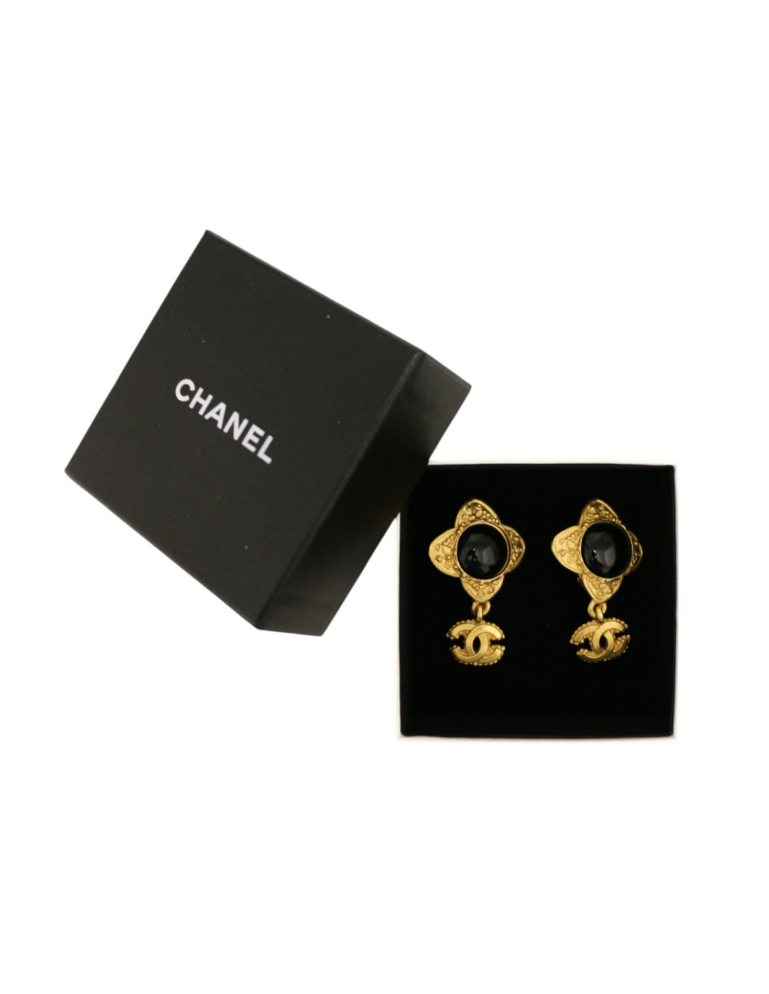 Détails : clips vintage, croix en métal doré ornée d'un cabochon rond en pâte de verre noire. Petit CC doré pendant.