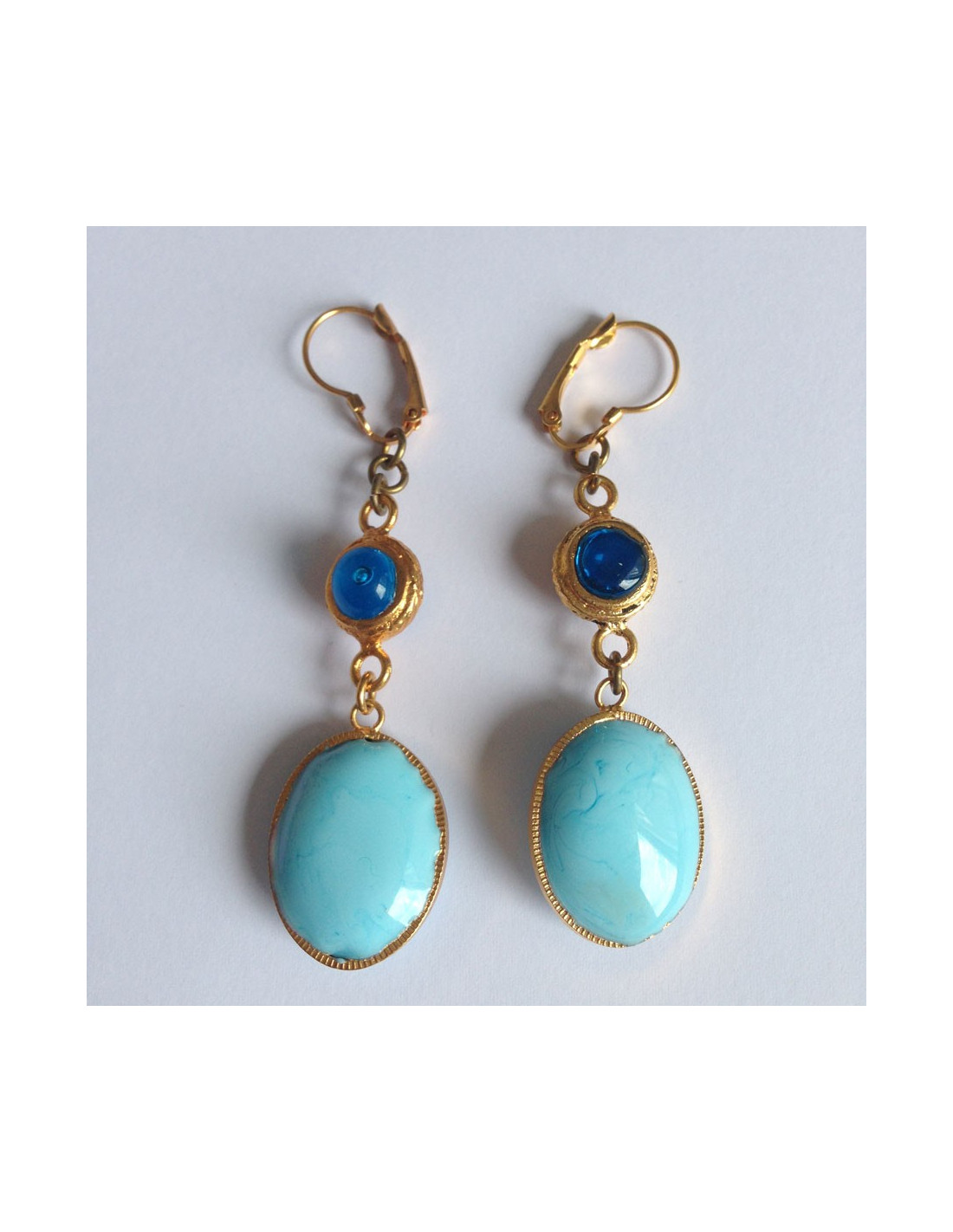 Clous d'oreilles Marguerite de Valois composé d'un ovale bleu layette opaque en pâte de verre réhaussé d'un rond de pâte de verre bleu transparent & métal doré à l'or fin