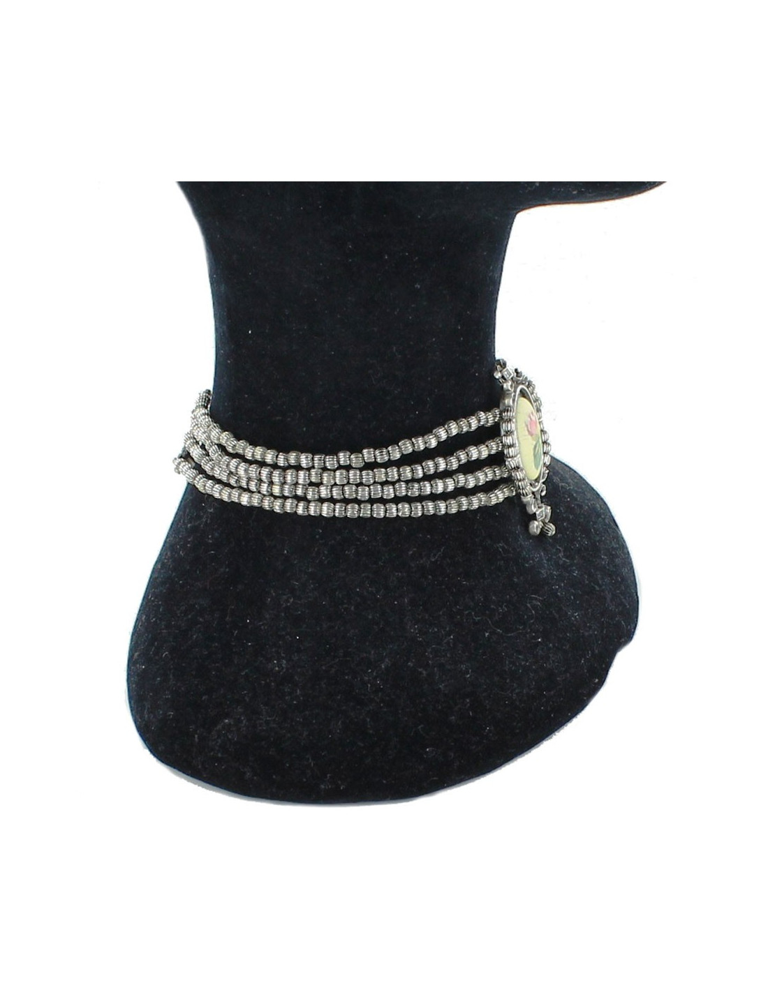 Le ras de cou est en métal argent vieilli de longueur 29 cm et la chaine 8 cm