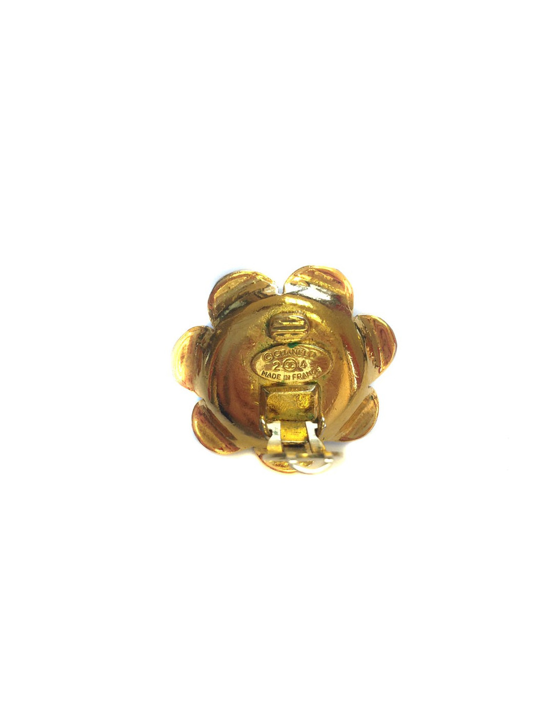 Intemporelle, paire de clips d'oreilles CHANEL en forme de fleur: paire en métal doré, demi-sphère perle nacrée avec un CC en métal doré sur le dessus et pétales émaillés noir. Clips vintage avec quelques petits micro éclats sur les perles. Très bon état général.