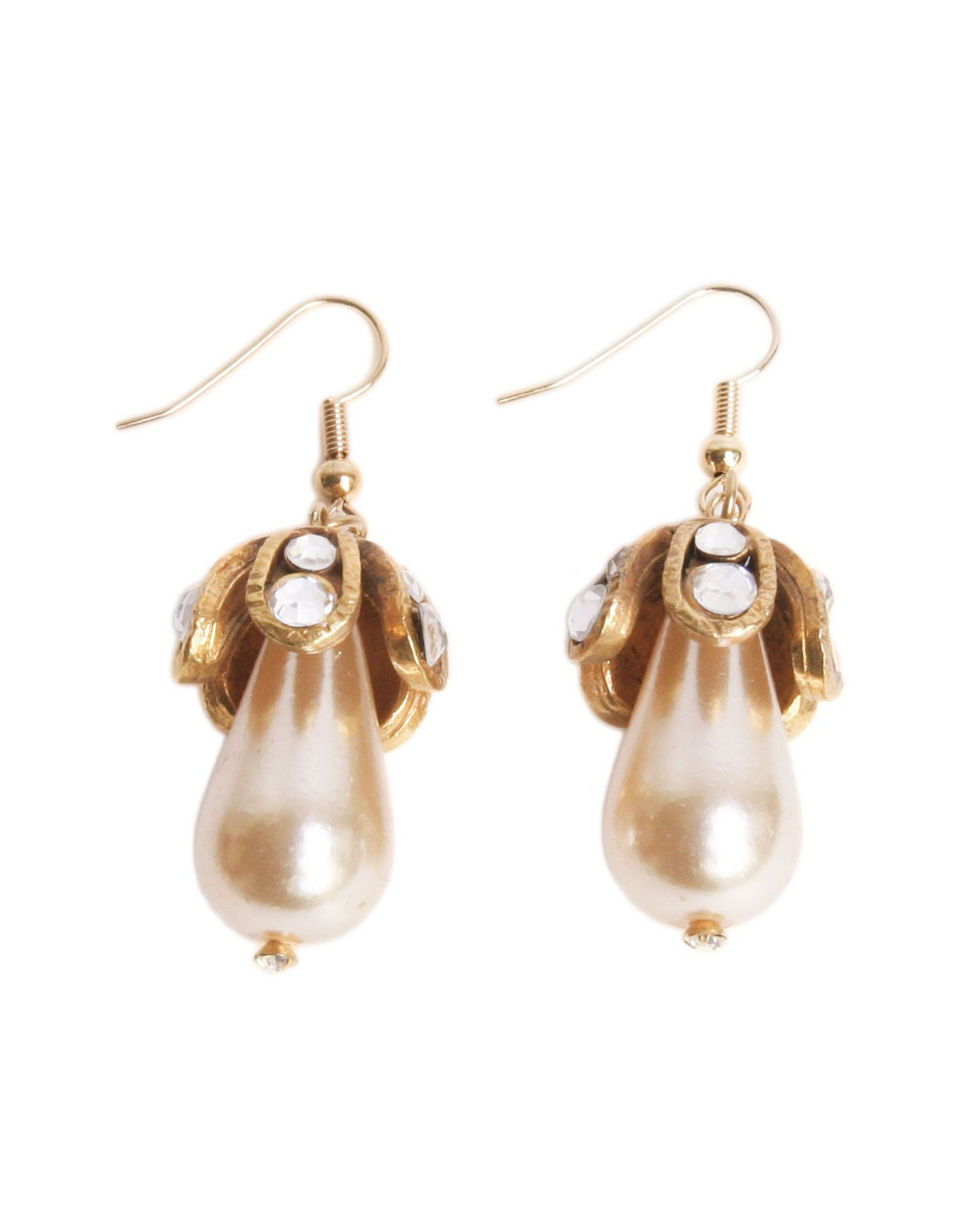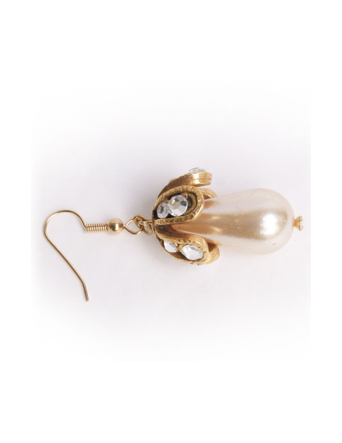 clous d'oreille Marguerite de Valois en métal doré et strass. Une perle nacrée ovale surmontée d'une perle émeraude, se termine par un strass lui donne toute son élégance. Métal doré.