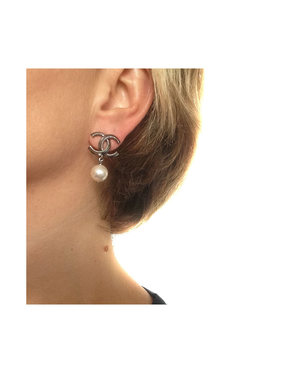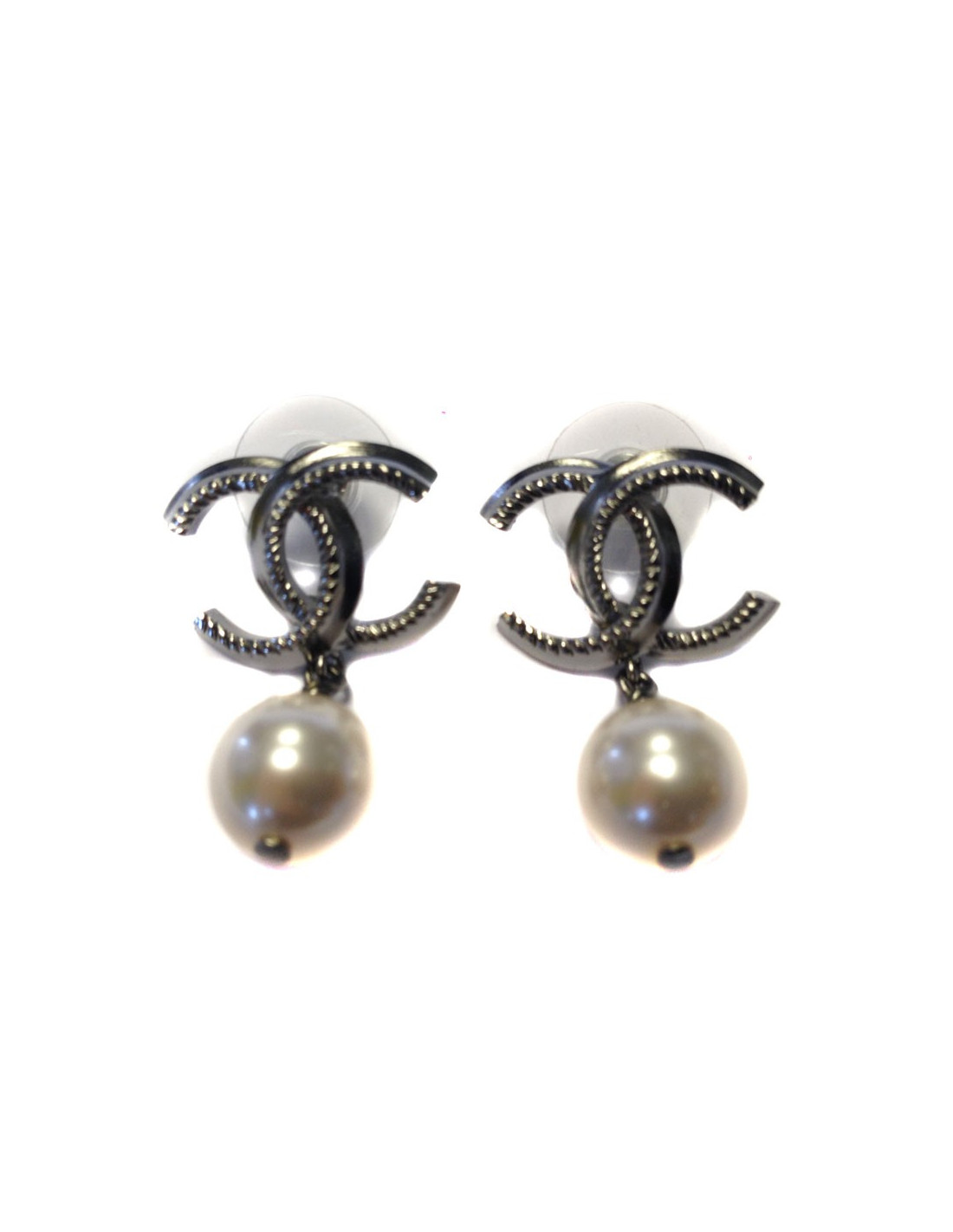 Clous d'oreilles Chanel, pendants crantés avec perles nacrées.