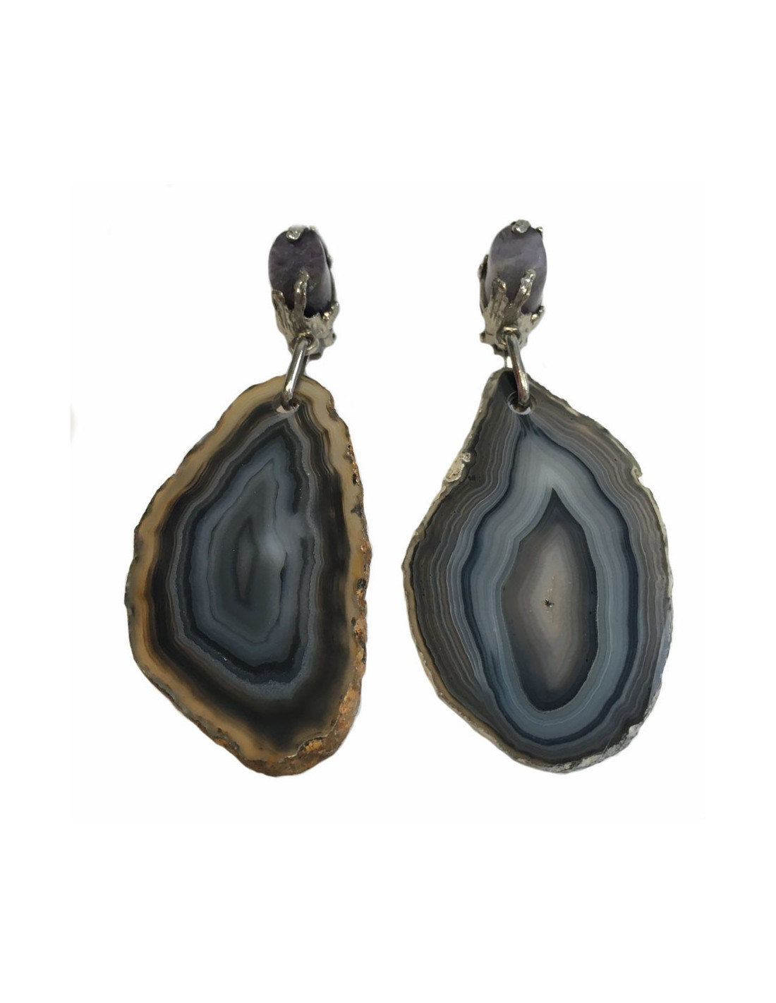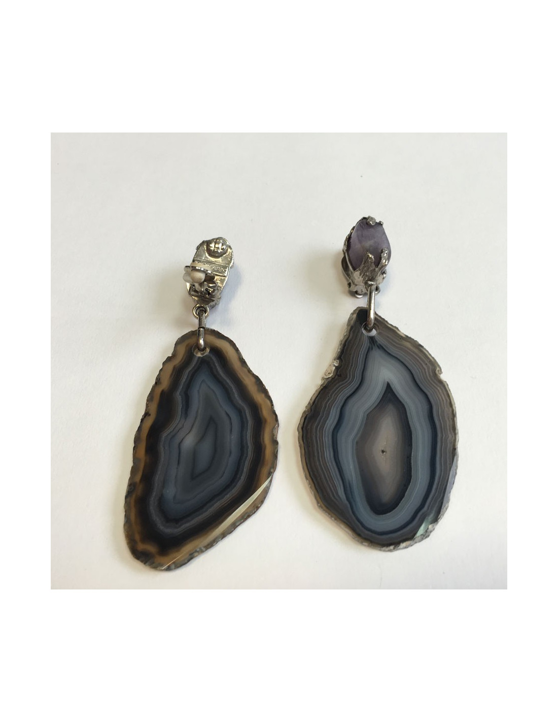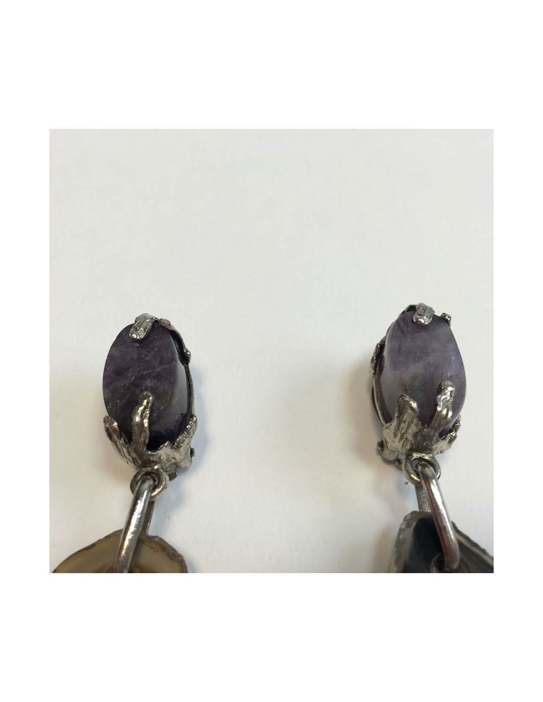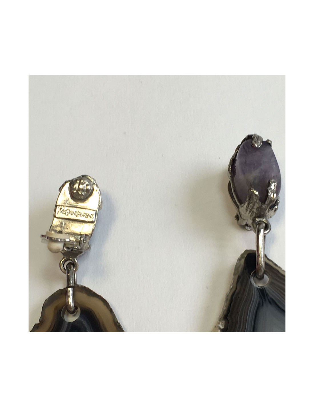 Boucles d'oreille clips YVES SAINT LAURENT pendants en pierre mauve et métal argenté. la paire est de forme irrégulière d'où son originalité. En très bon état.