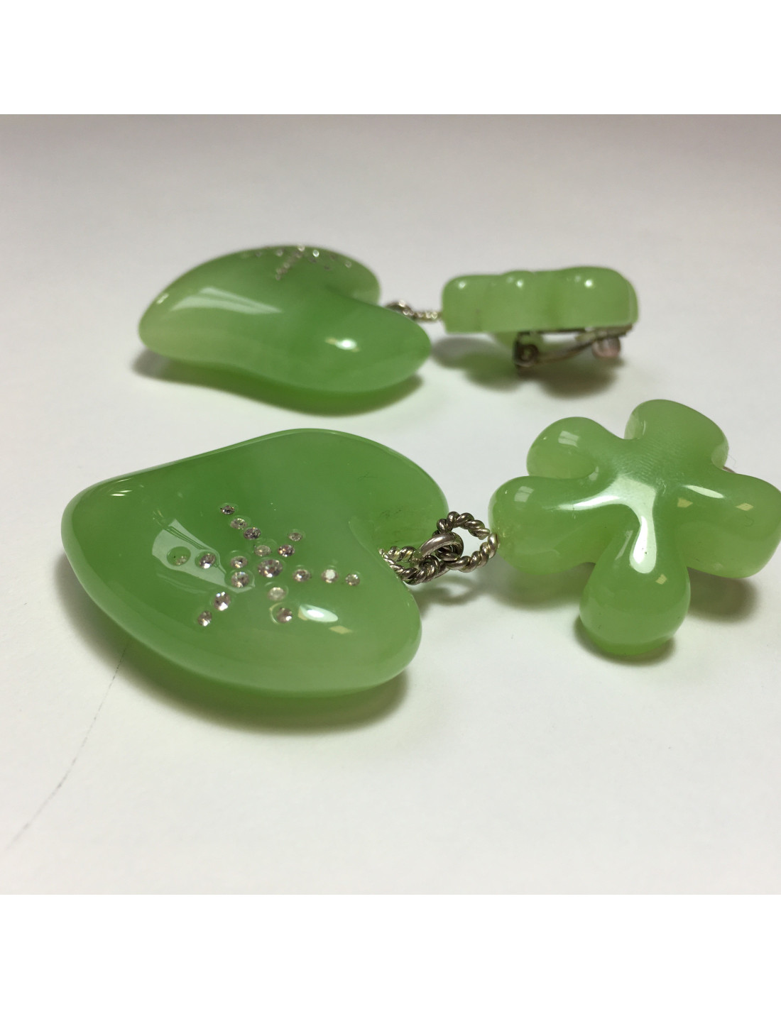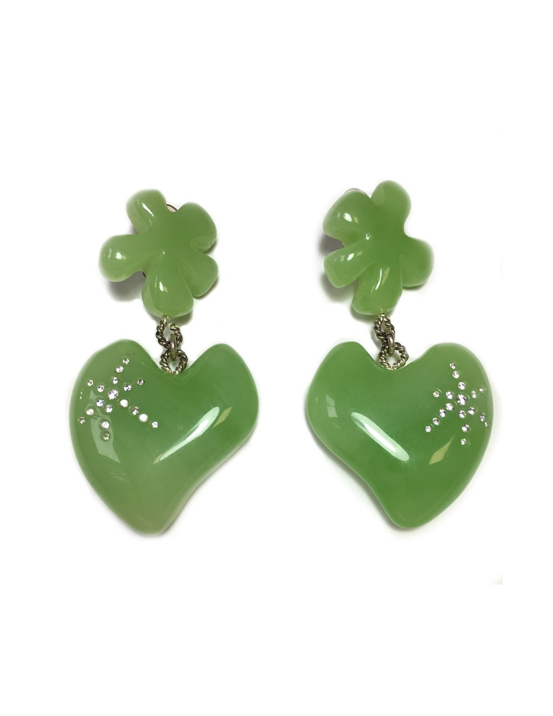 Boucles d'oreille clips CHRISTIAN LACROIX pendants en résine vert d'eau. Clips vintage. Une étoile en strass se situe sur chaque coeur. Très bon état.