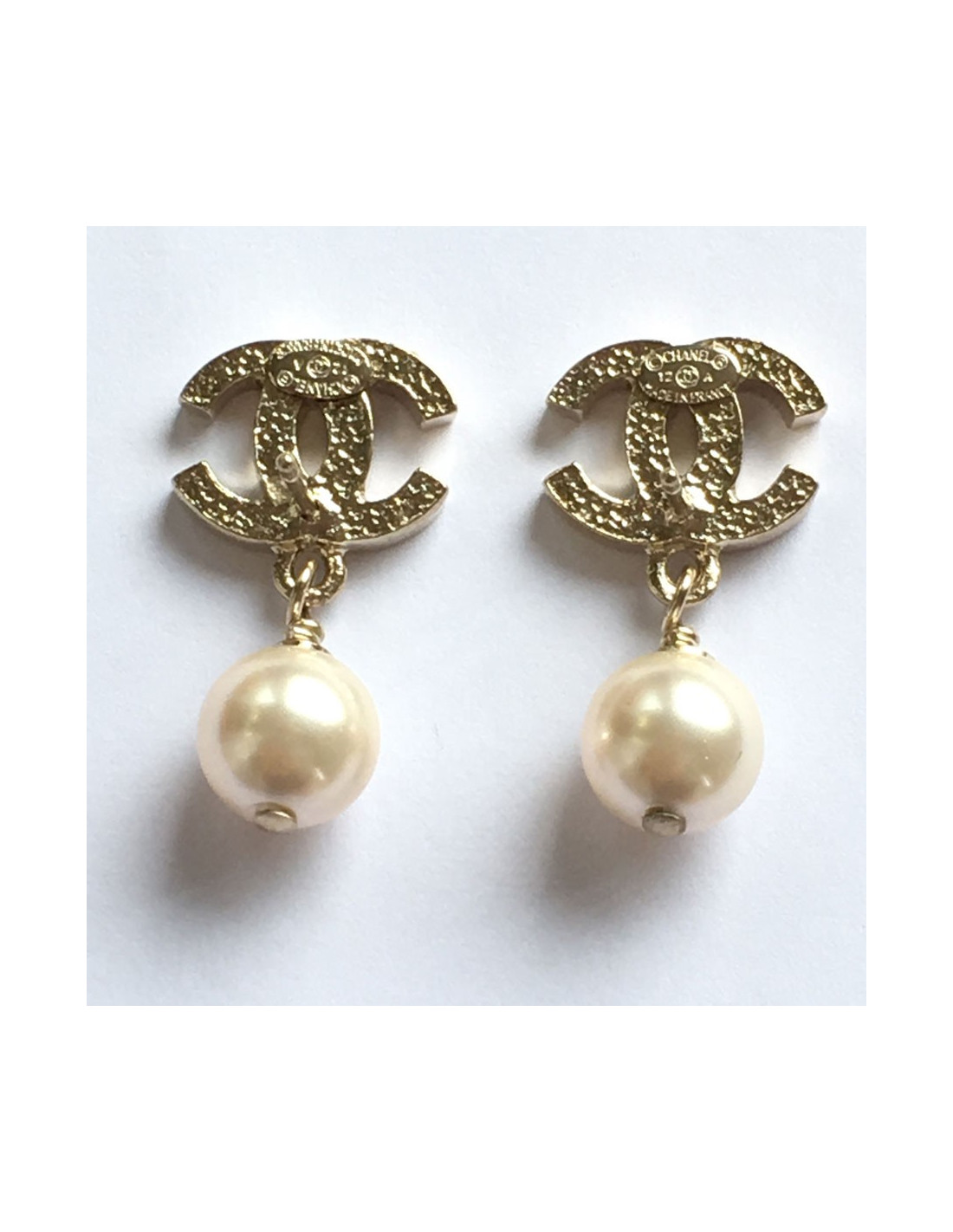 Boucles d'oreille clous CHANEL métal guilloché doré & perle nacrée