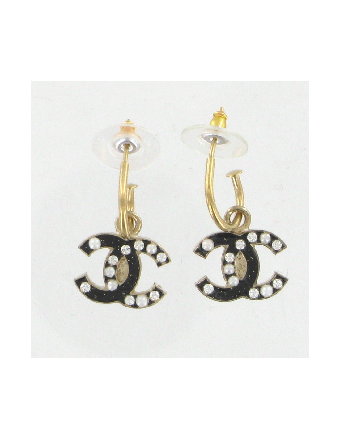 Créoles CC CHANEL émail noir, strass et perles nacrées