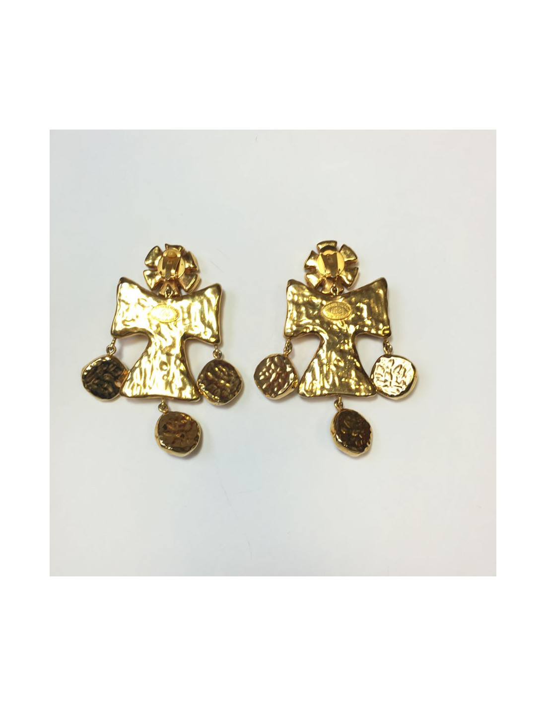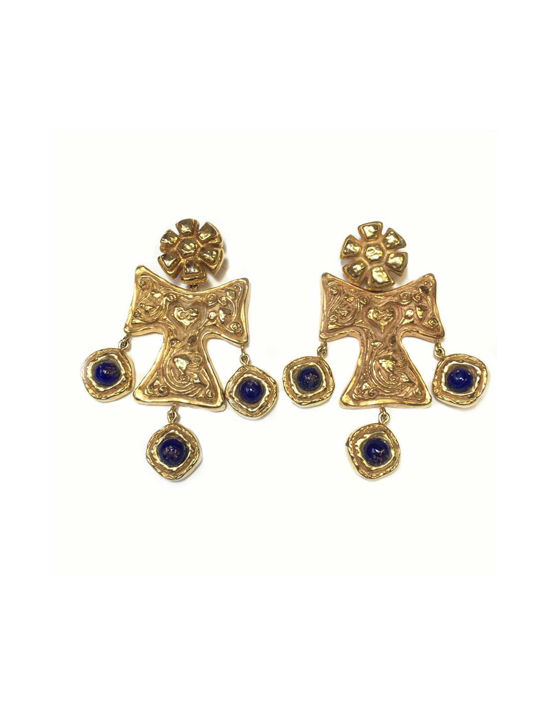 Imposantes boucles d'oreille clips CHRISTIAN LACROIX couture. En métal doré et pierre bleue pailletée or sur le dessus. En très bon état. Pastille de la marque présente au dos.