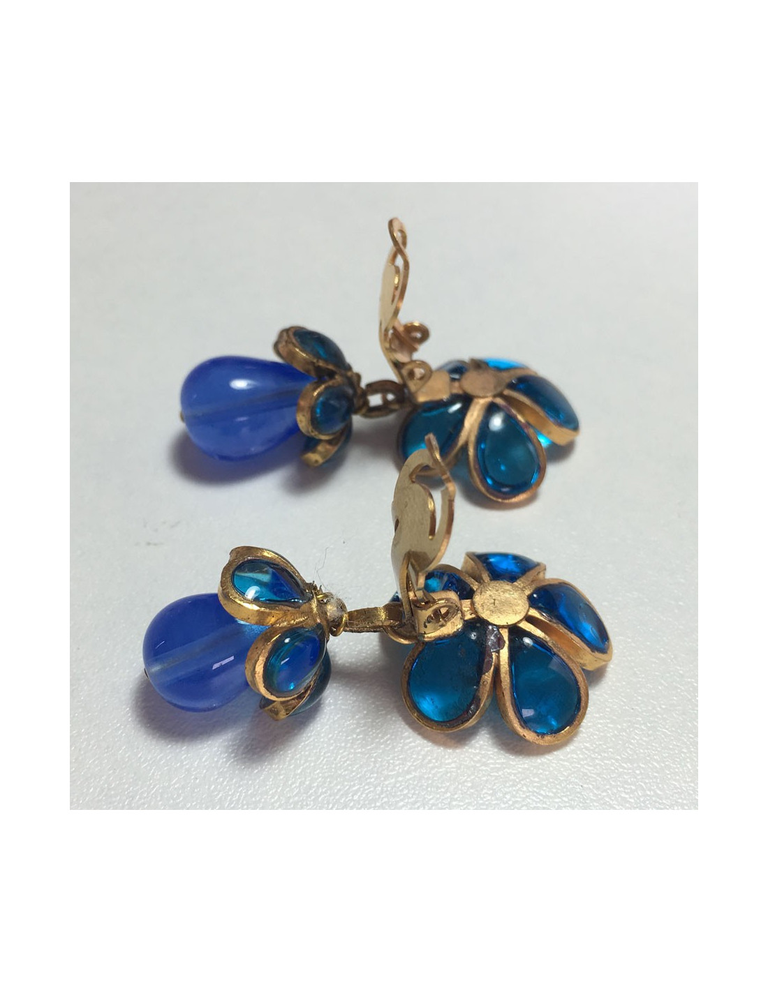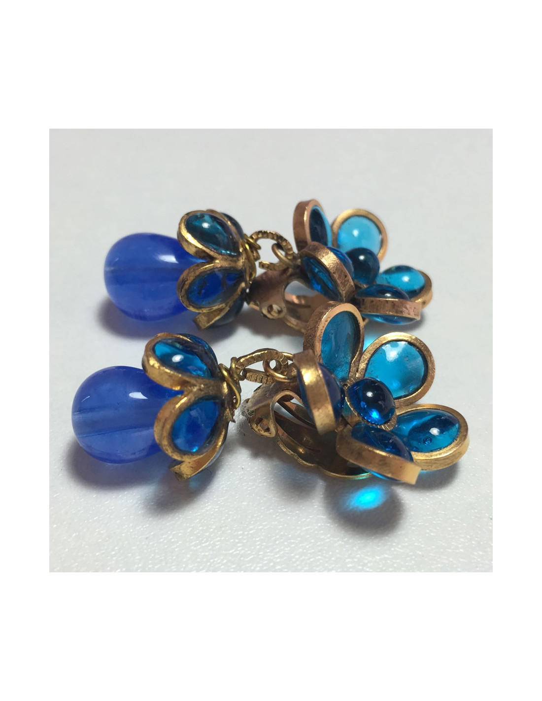 Boucles d'oreille clips d'oreilles Marguerite de Valois en pâte de verre bleue et métal doré à l'or fin. Fleurette et perle goutte en pâte de verre. Bijou Couture vintage.