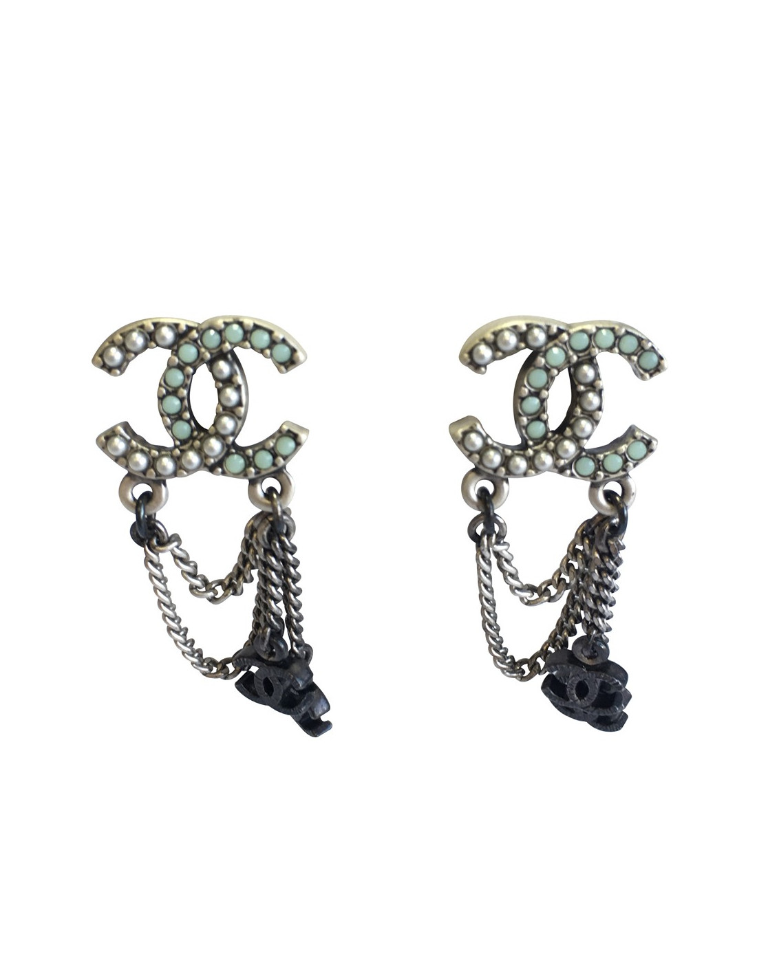 Boucles d'oreille clous pendants CHANEL CC en métal argenté et petite chaîne. Petites perles nacrées et strass couleur jade. Jamais portées.