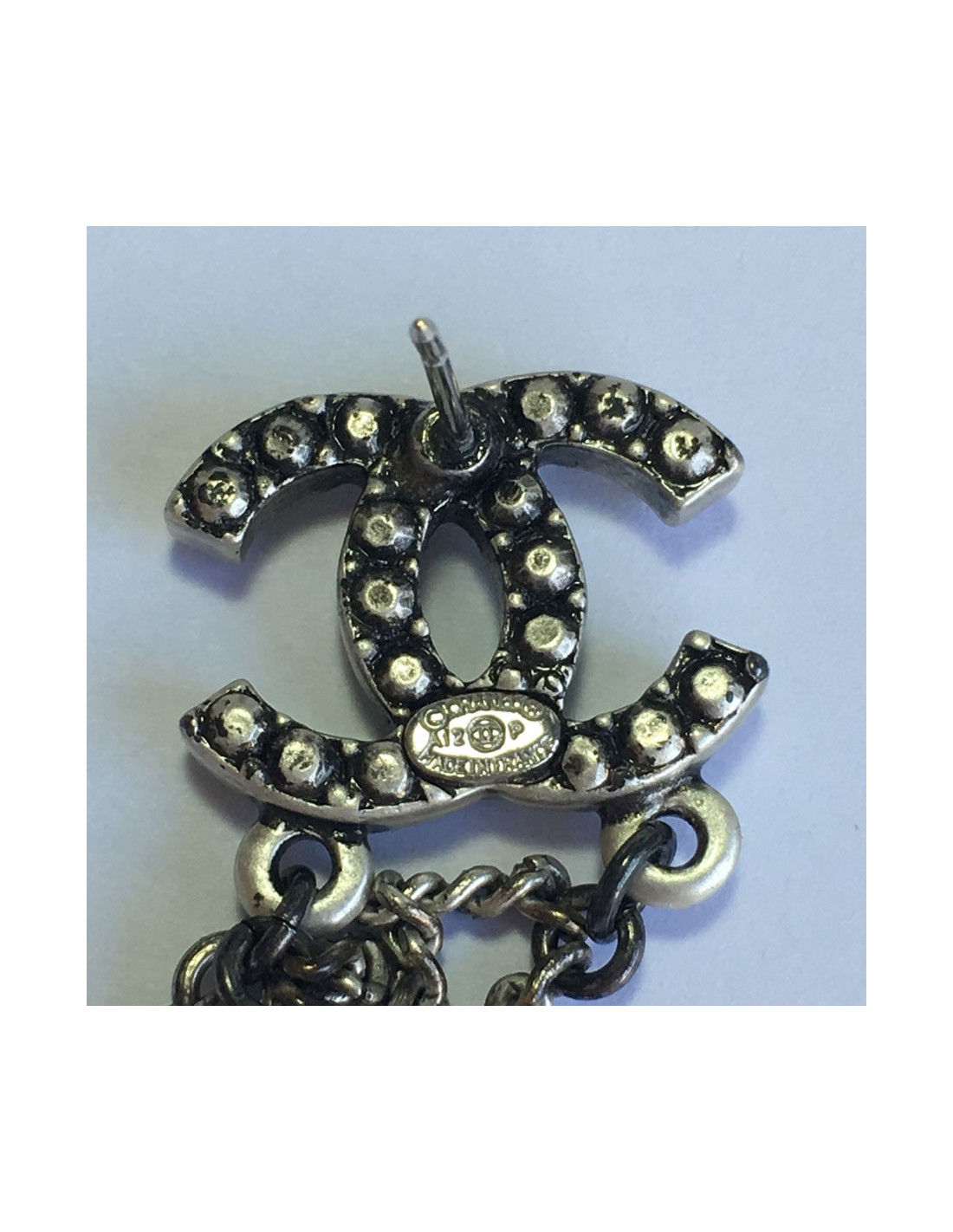 Boucles d'oreille clous pendants CHANEL CC en métal argenté