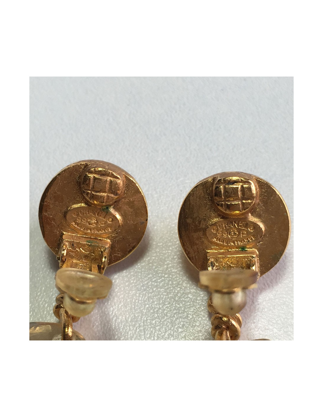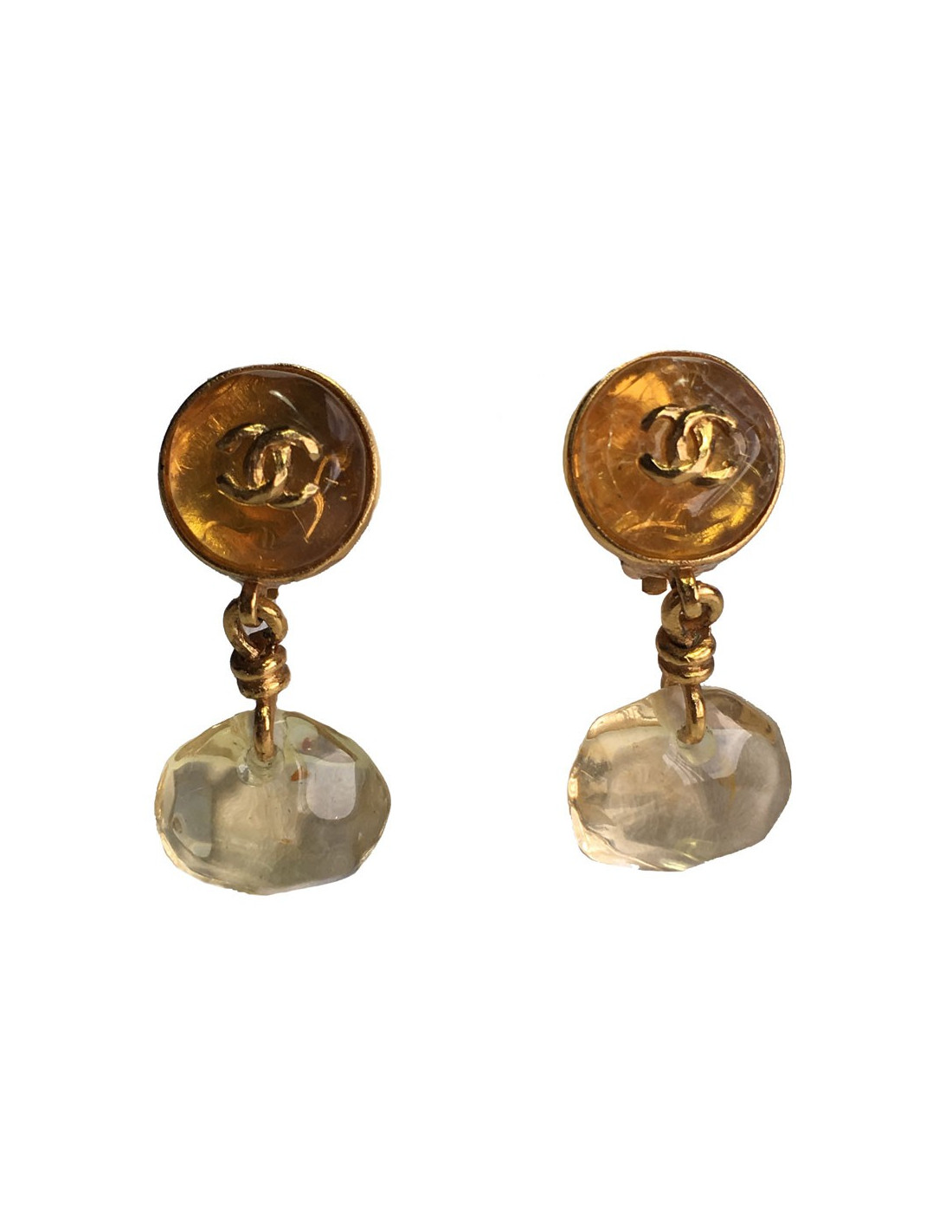 Boucles d'oreille clips CHANEL vintage en métal doré et façon résine couleur ambre. Petit CC doré. Sur une des boucles la résine est fendue (voir photo).