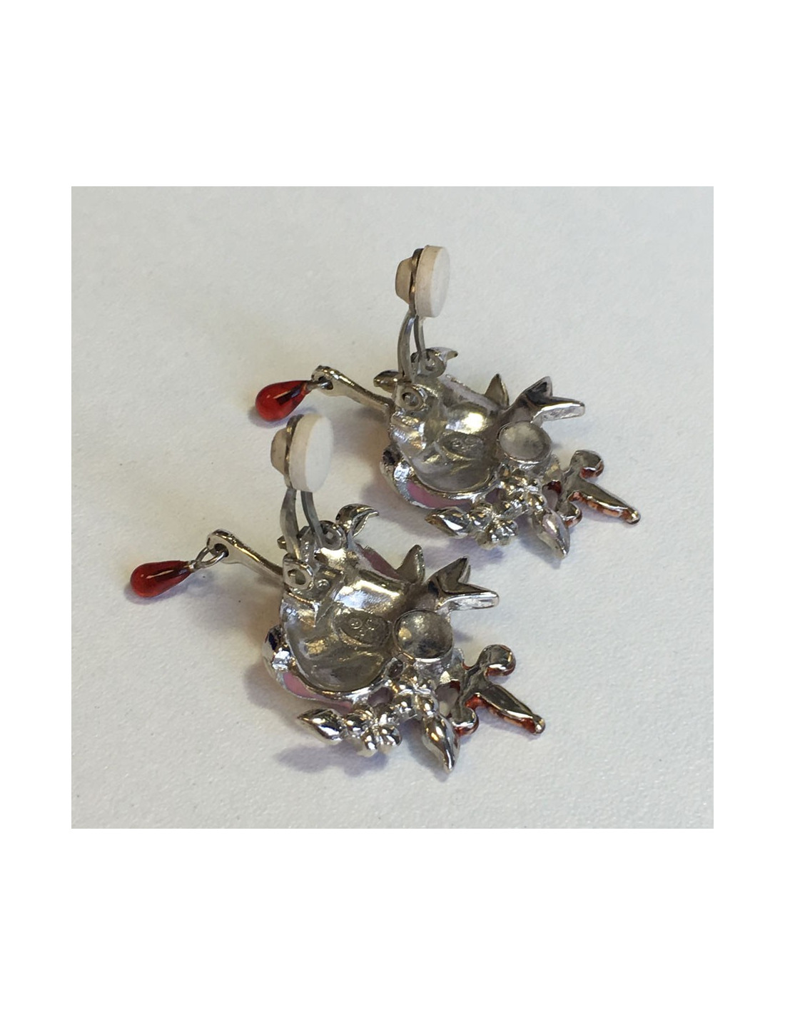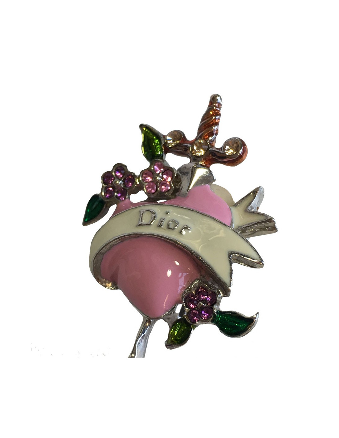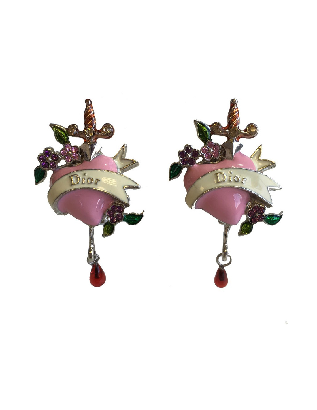 Très jolie paire de boucles d'oreille clips DIOR. En métal argenté, coeur rose serti de petites fleurs en strass rose, feuilles en strass vert, petite perle rouge et une petite épée.