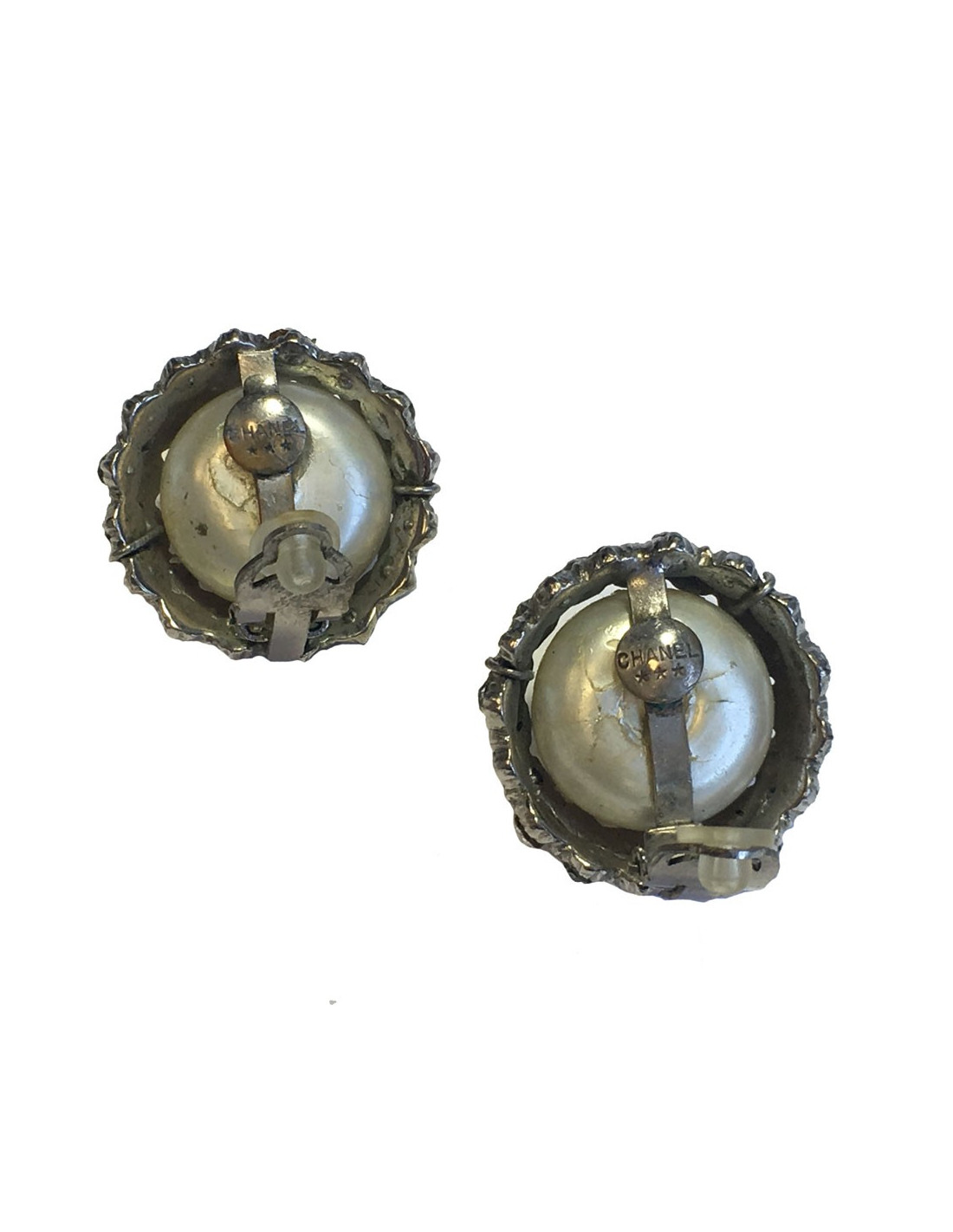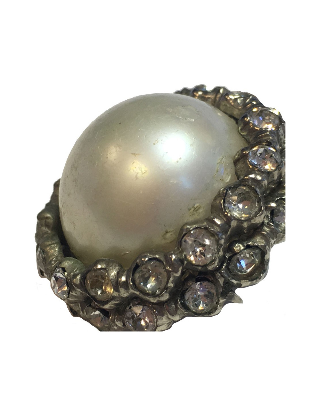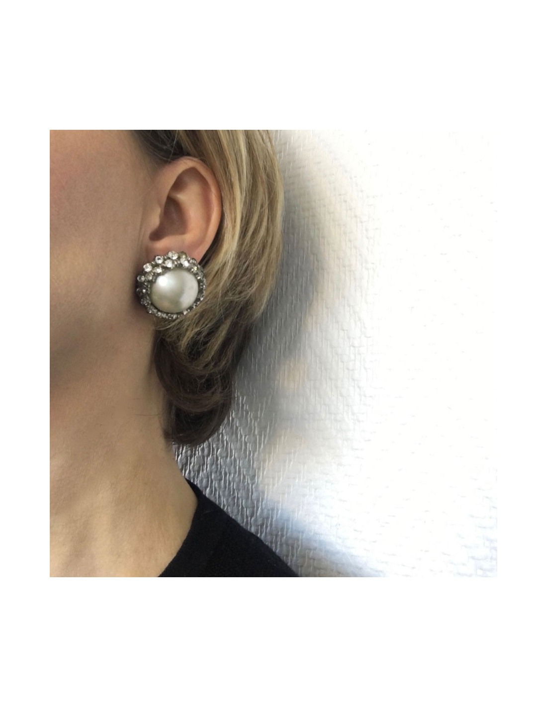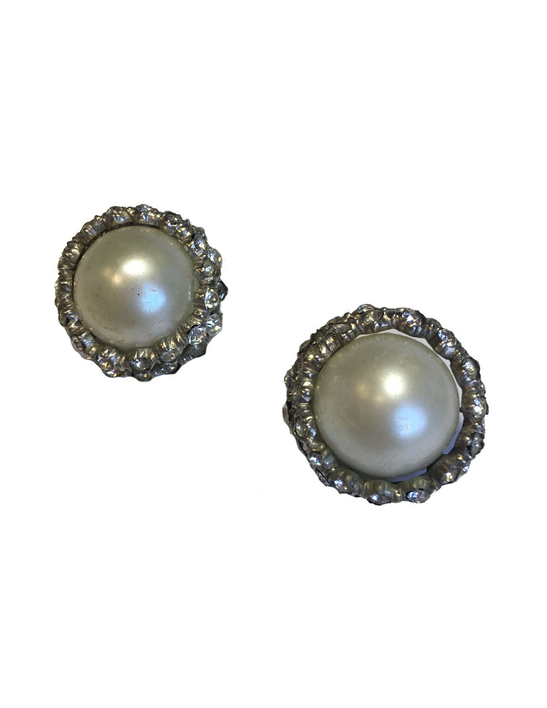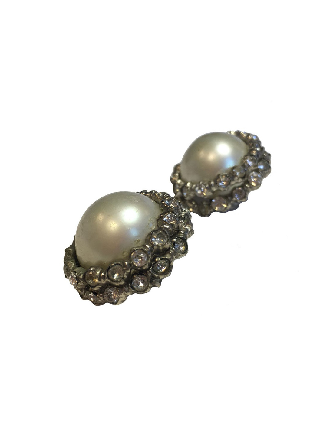 Boucles d'oreille clips CHANEL perle vintage. En métal argent, perles nacrées en pâte de verre au centre serties de deux rangées de strass. Bijou Couture.