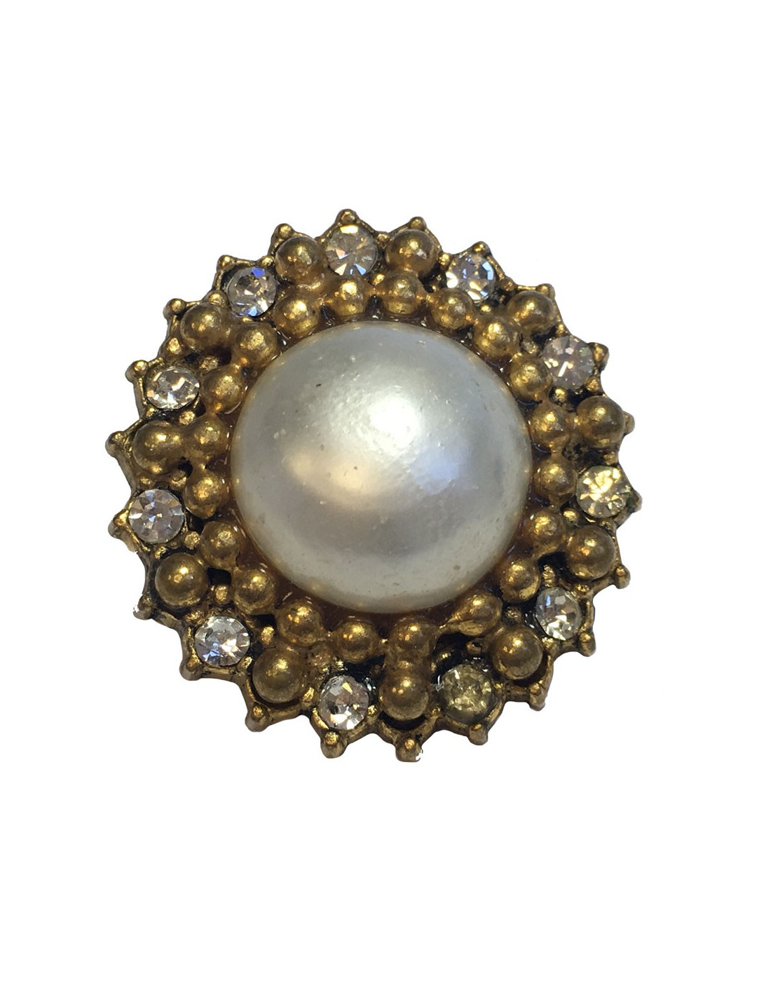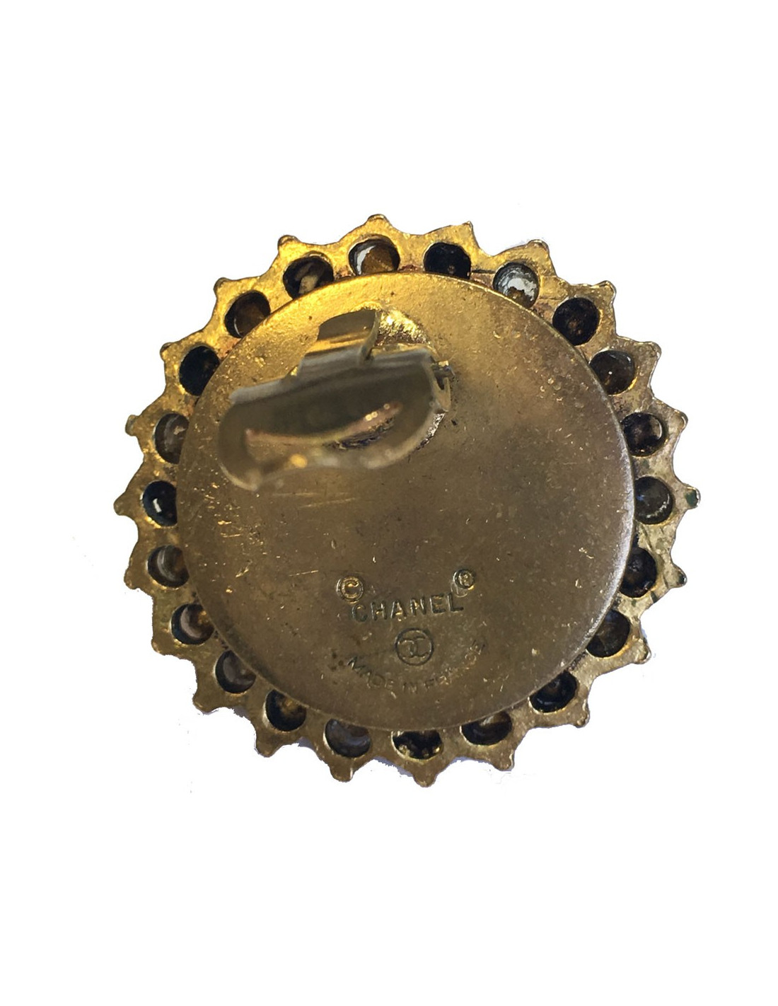 Couture! boucles d'oreille clips CHANEL, en métal or vieilli, perle en pâte de verre nacrée entourée d'une rangée de strass. Bijou vintage. En bon état. Des micro rayures sur la perle.