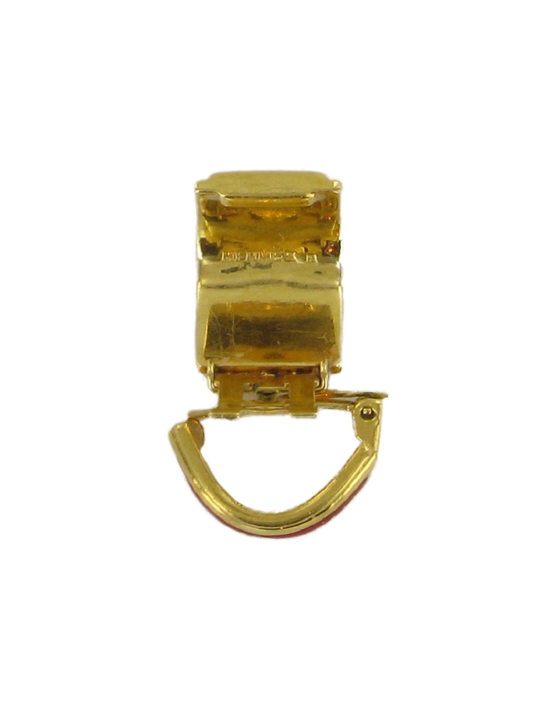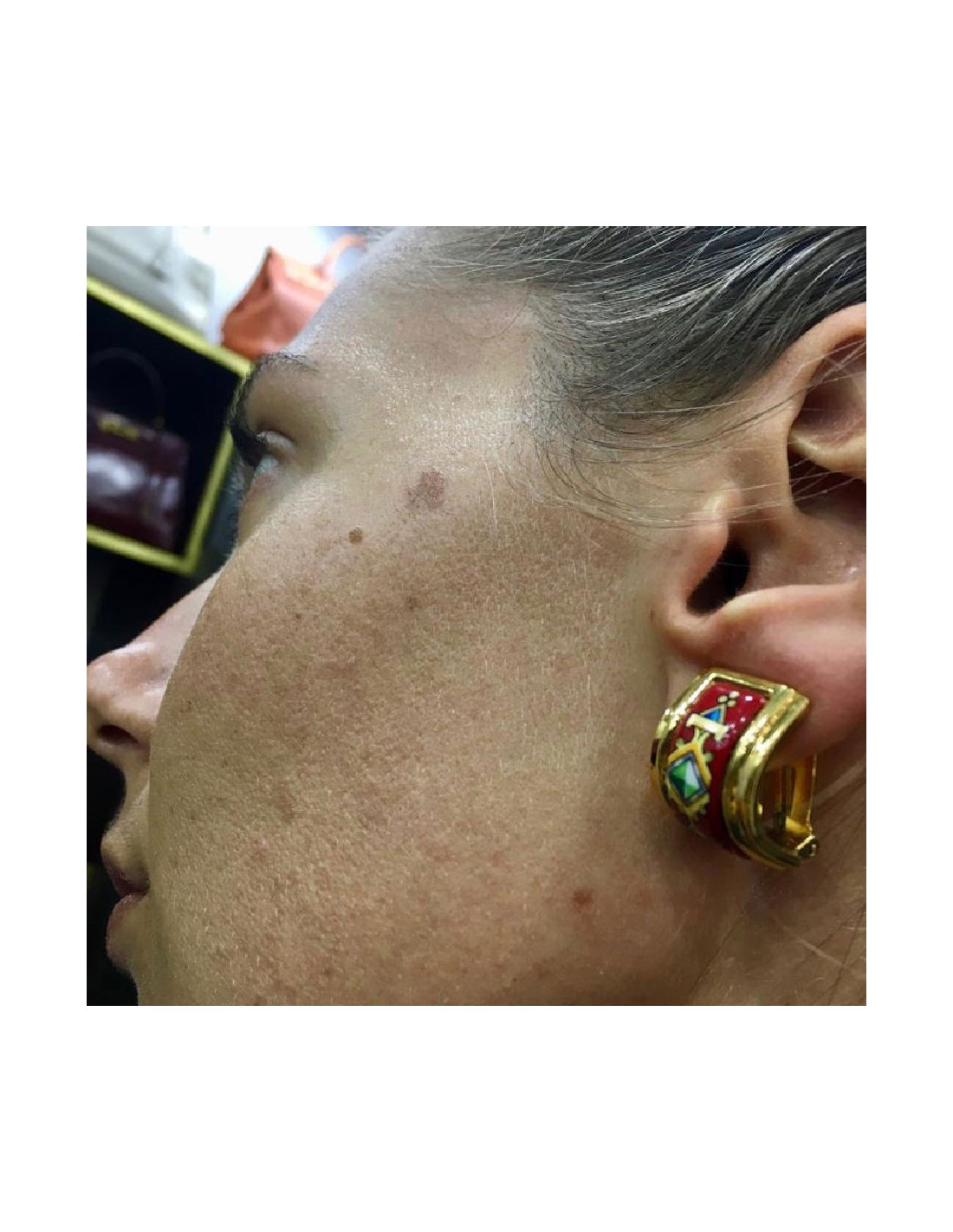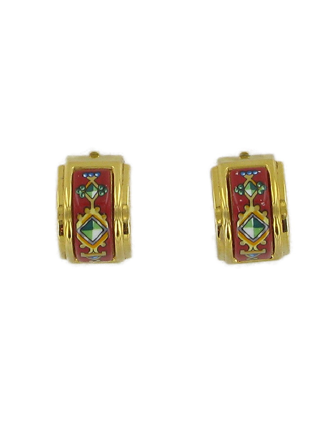 Ravissants clips d’oreilles Hermès en émail rouge bordeaux et métal doré à l’or fin. L’émail de ces boucles d’oreilles Hermès est rehaussé par des élégants motifs multicolores.