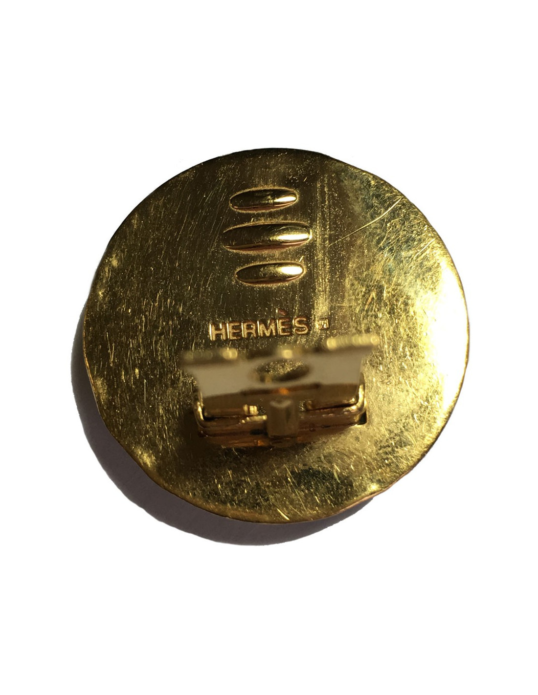 Boucles d'oreille clips HERMES rondes en plaqué or et émail noir à motif coloré.