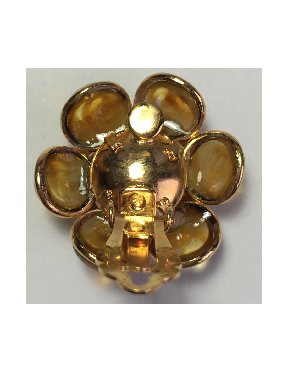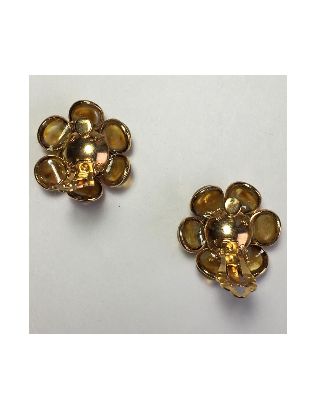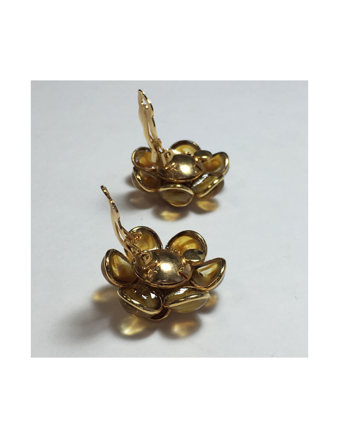 Boucles d'oreille clips MARGUERITE DE VALOIS fleur en métal doré à l'or fin et pétales en pâte de verre de couleur ambre.