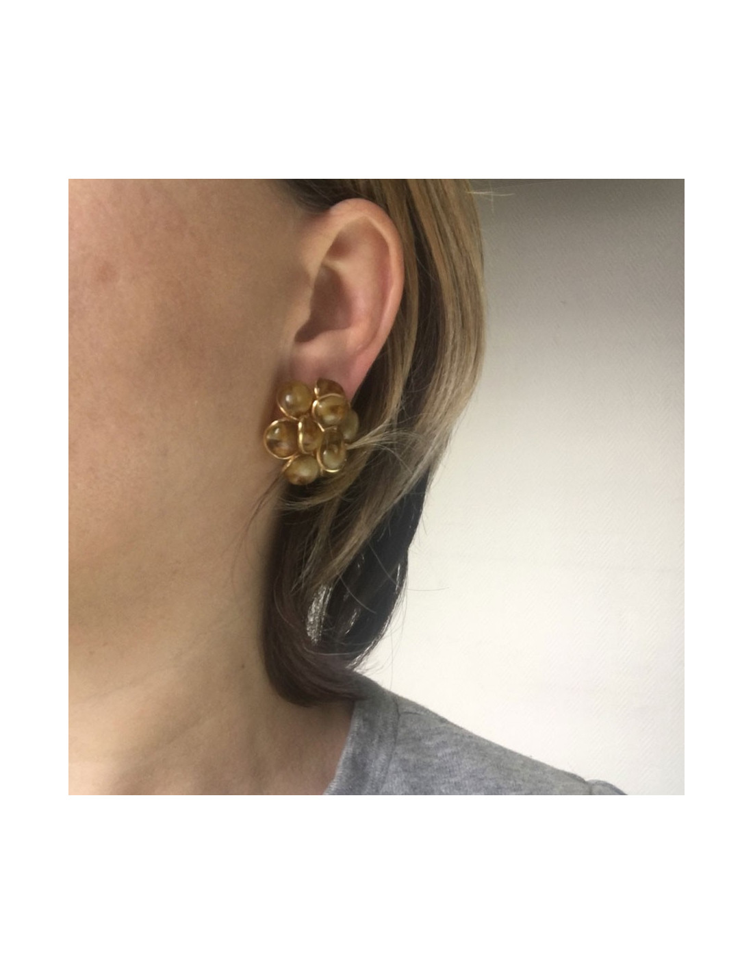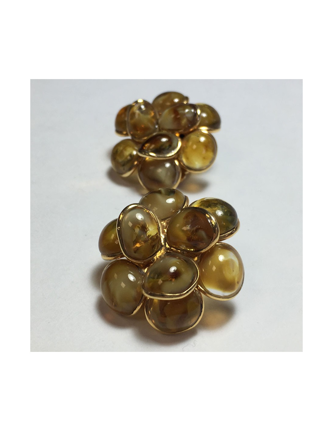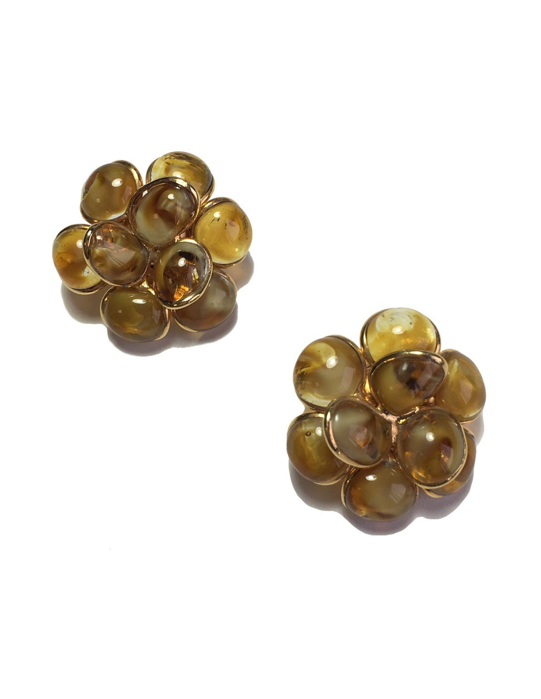 Boucles d'oreille clips MARGUERITE DE VALOIS fleur en métal doré à l'or fin et pétales en pâte de verre de couleur ambre.