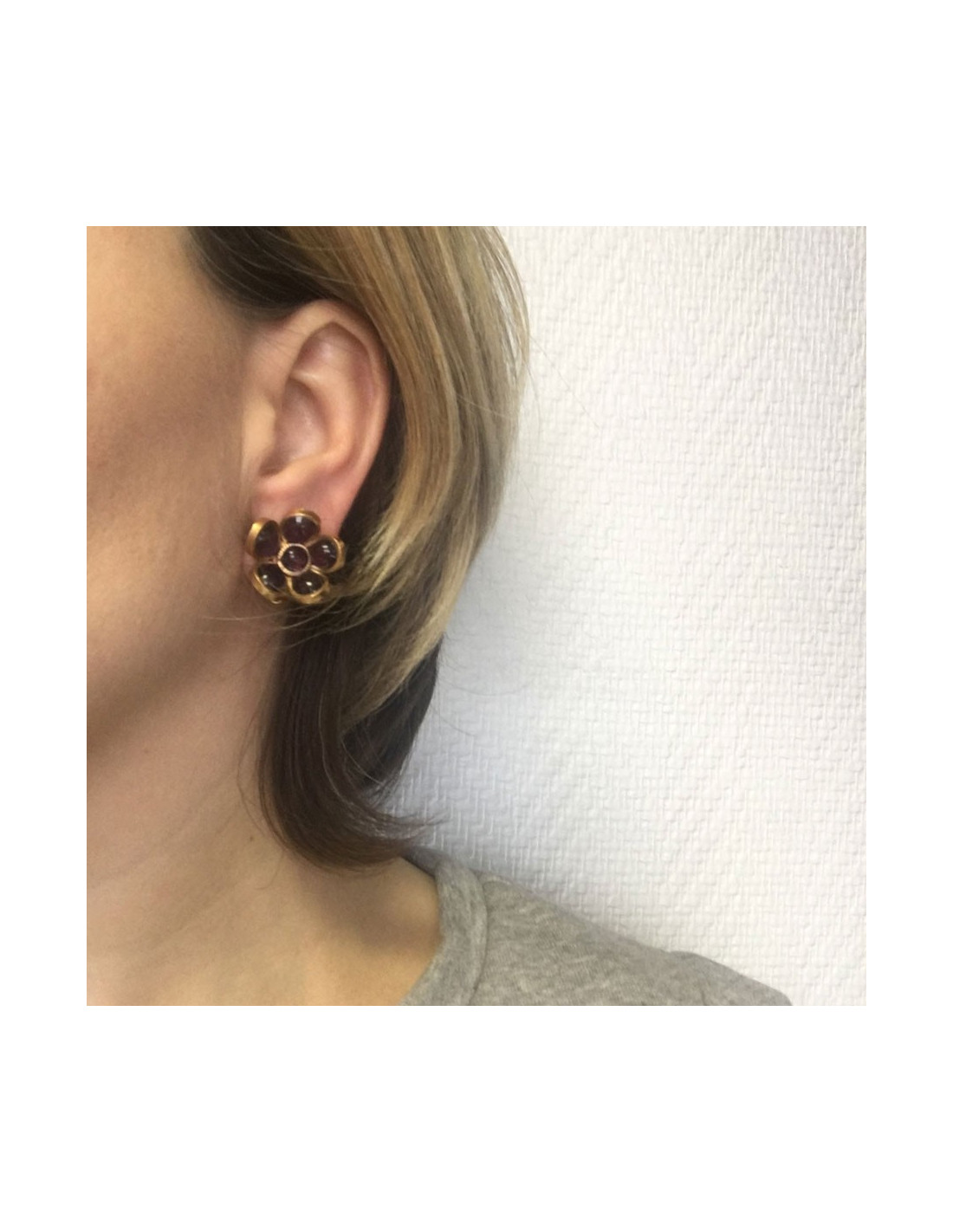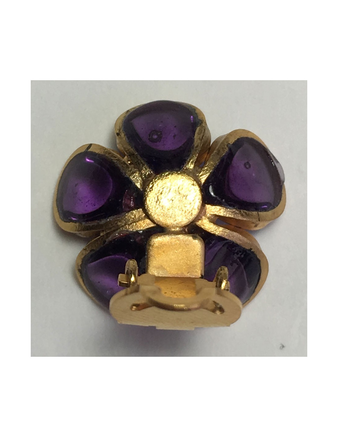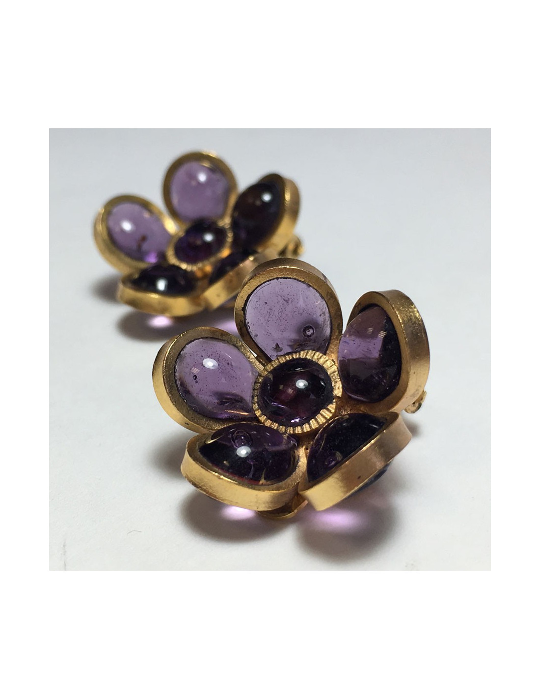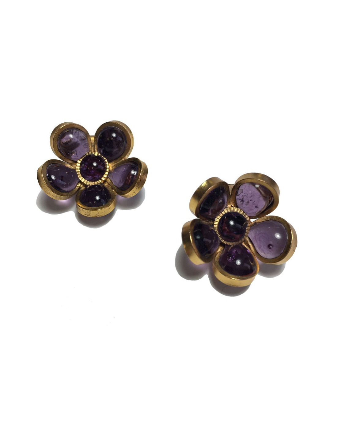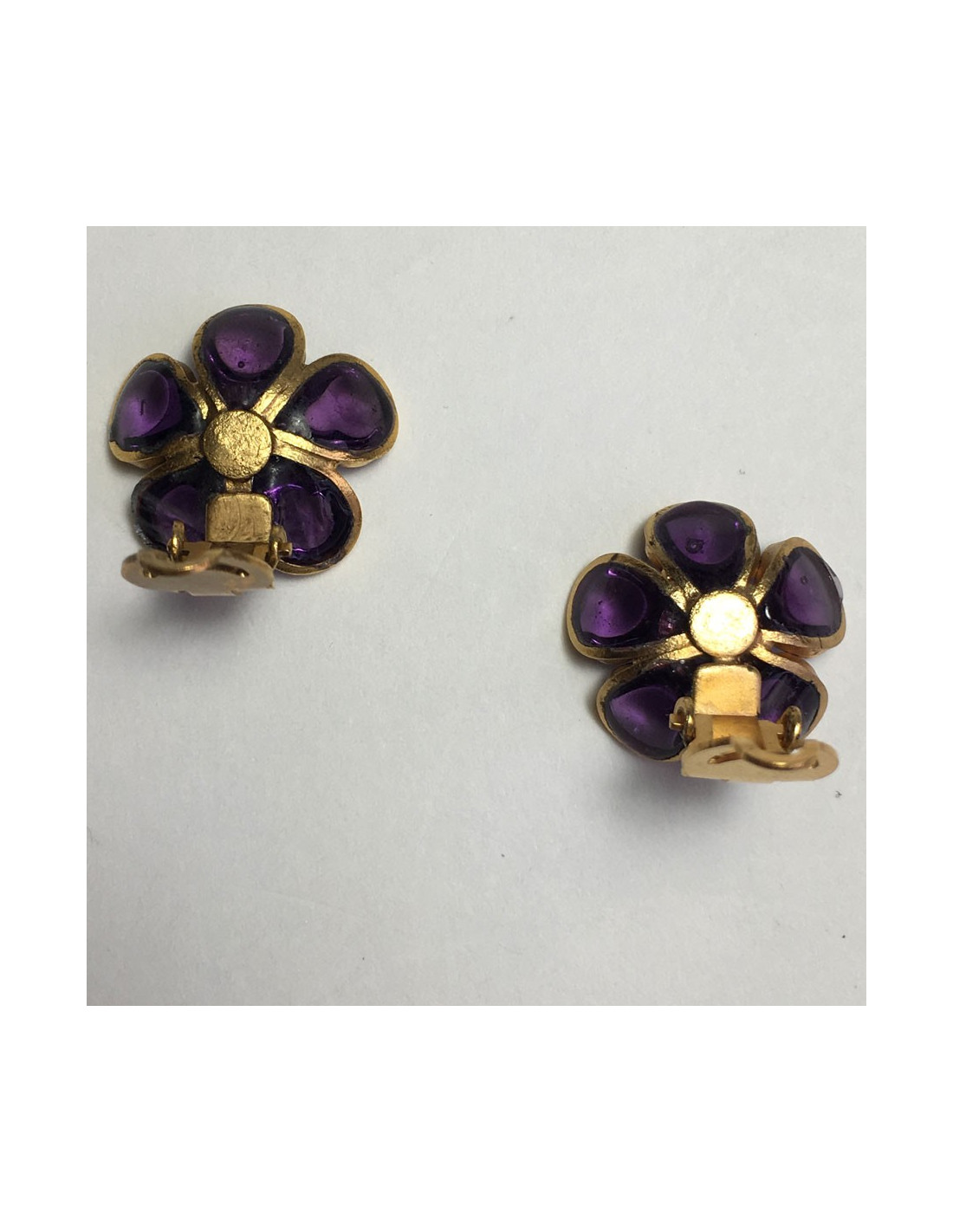 Boucles d'oreille clips d'oreilles Marguerite de Valois fleur, en pâte de verre violet et métal doré à l'or fin.