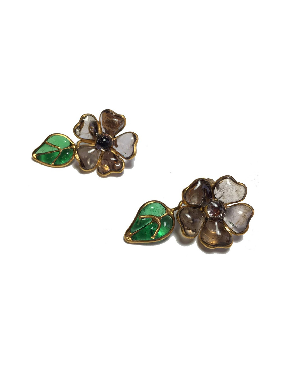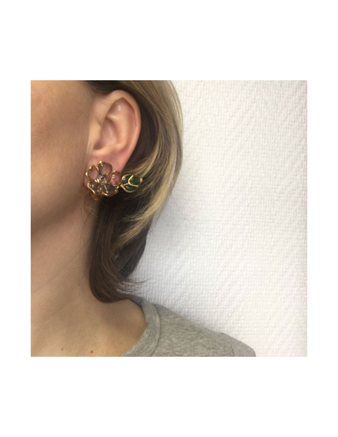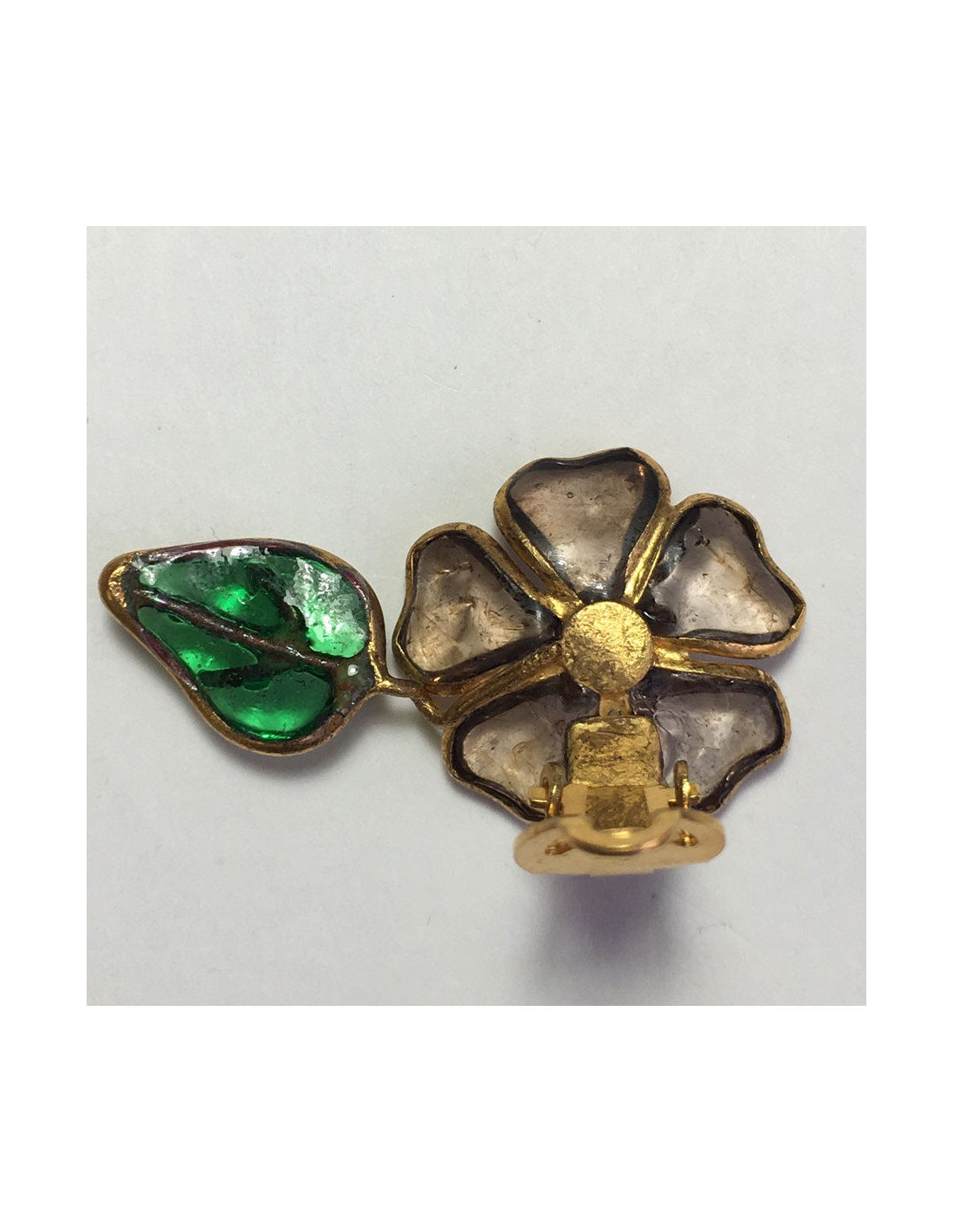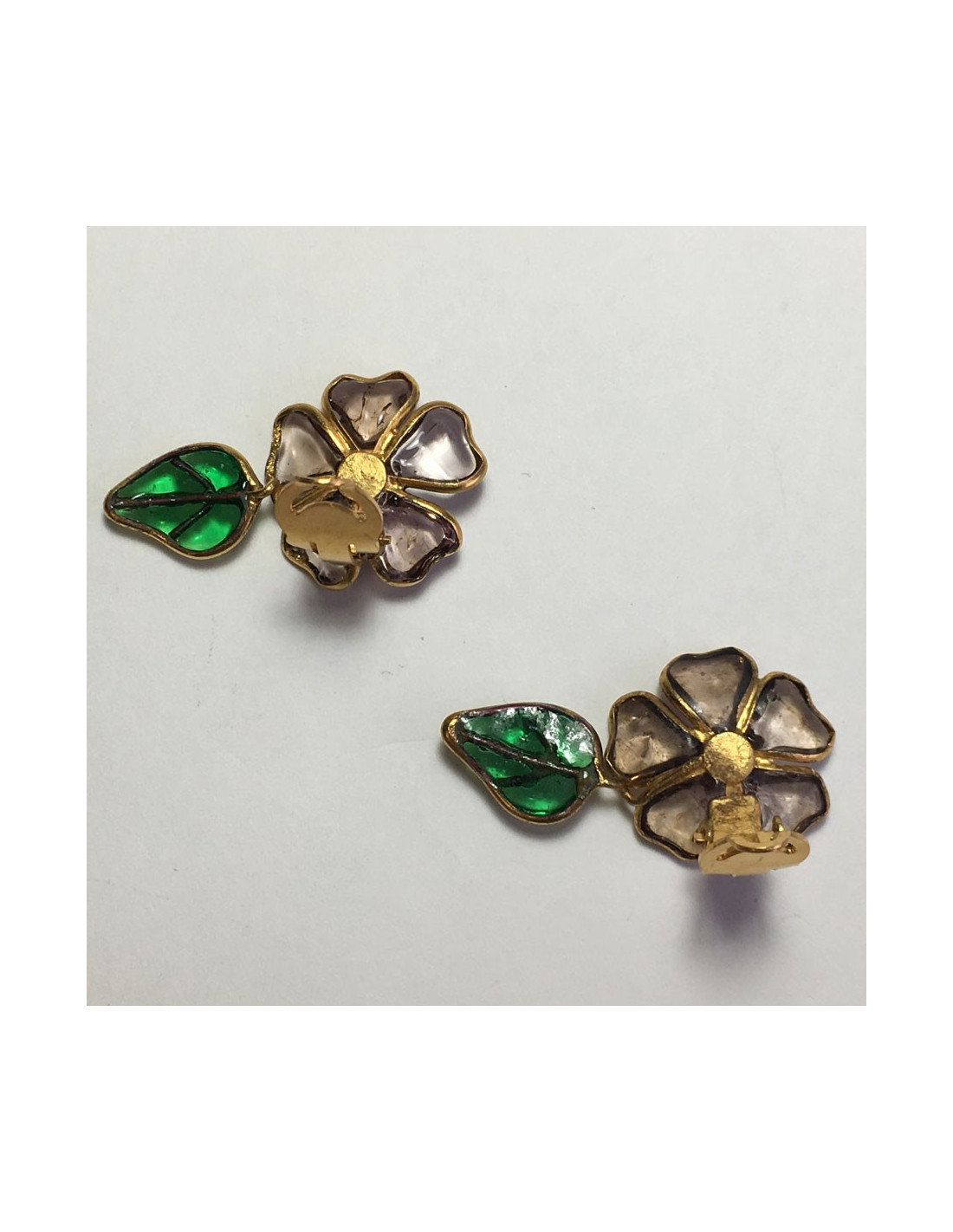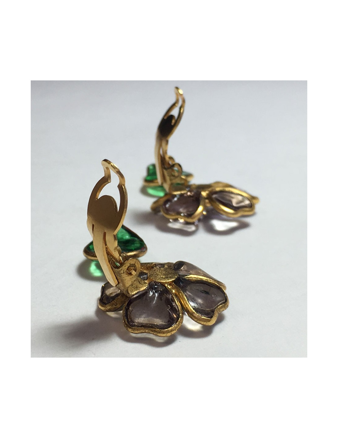 Belle paire de boucles d'oreille clips MARGUERITE DE VALOIS, fleur en pâte de verre mauve et feuille en pâte de verre verte. Métal doré à l'or fin.