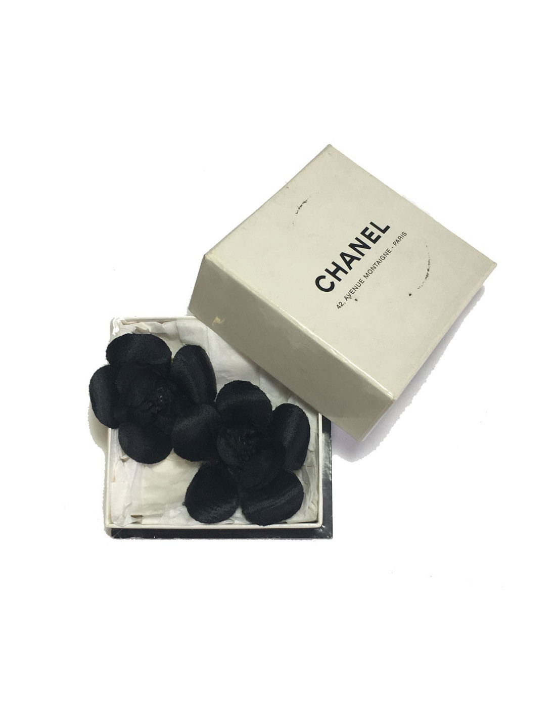 Collector! Superbe paire de boucles d'oreille clips CHANEL Couture camélias en soie noire.