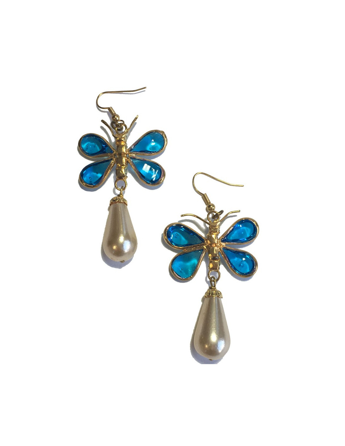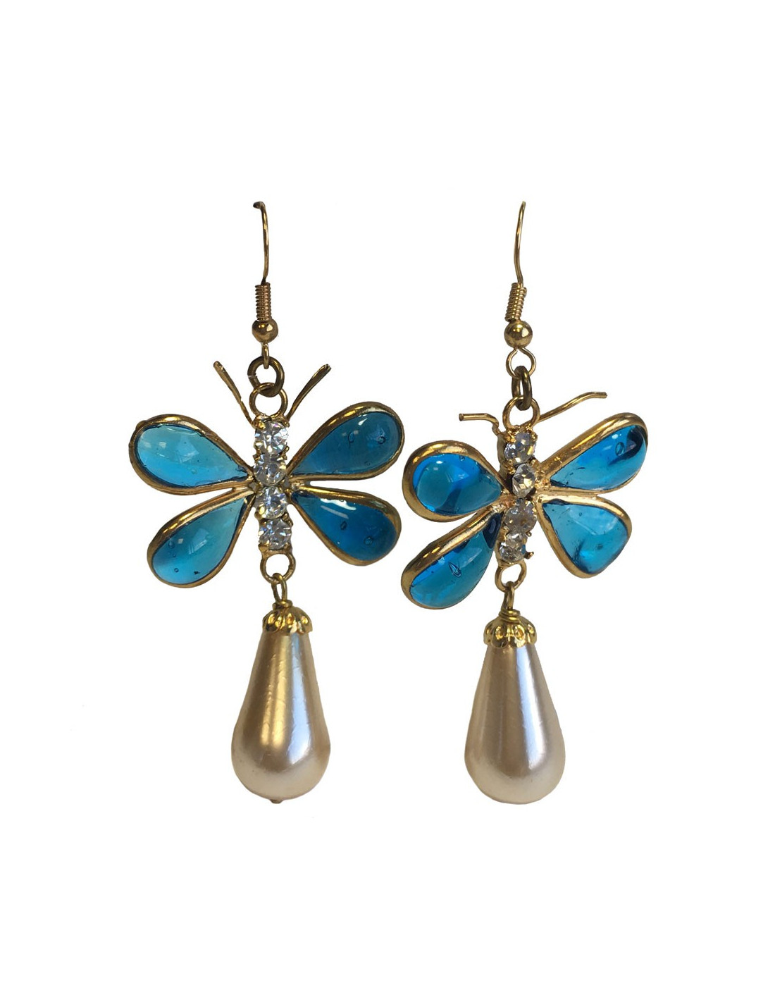 Détails : le corps du papillon est fait de 4 strass. La perle en forme goutte est en pâte de verre nacrée. Elles sont en très bon état mais une des perles a de petites traces à peine visible