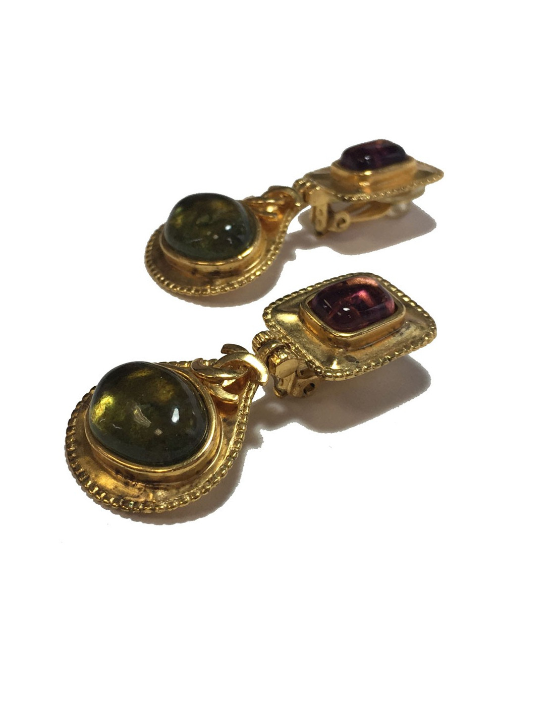 Couture ! Boucles d'oreille clips Chanel en métal doré et pierres semi précieuses vert ambre et rose.